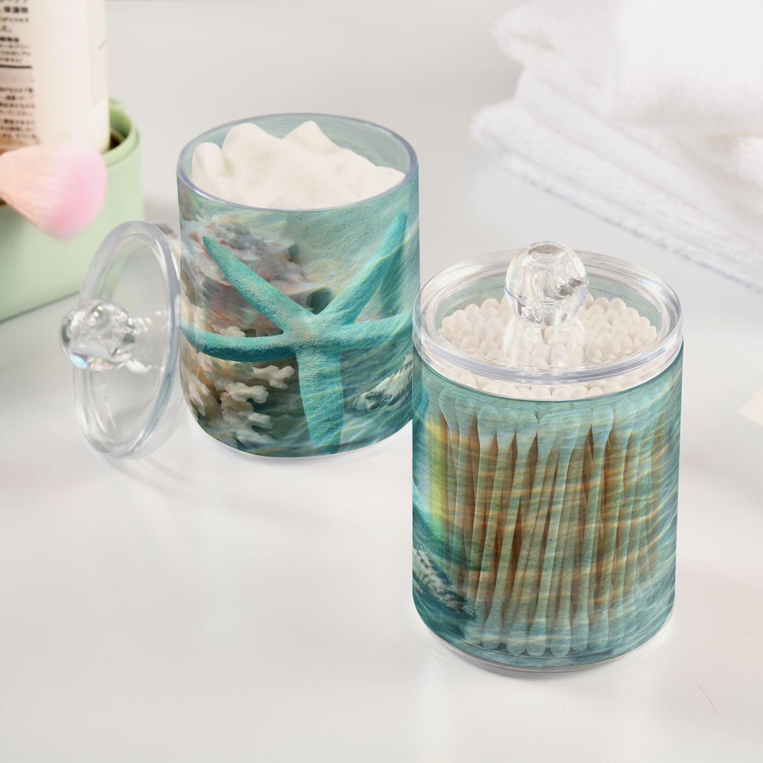 2 Pack Qtip Holder Organizer Dispenser Seashell Starfish Summer Beach Bathroom Storage Canister Cotton Ball Holder Container for Cotton Swabs/Pads/Floss