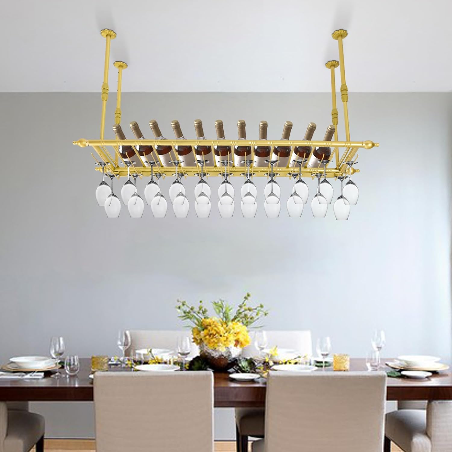 - 【Widely Used】This hanging wine rack can be installed in home wine cabinets, kitchens, hotels, breweries, wine cellars, bars and other food and beverage venues. It provides you with a place to store Bordeaux glasses, Burgundy glasses, white wine glasses, tulip shaped glasses, champagne flute glasses, cocktail glasses, brandy glasses, and ear glasses.