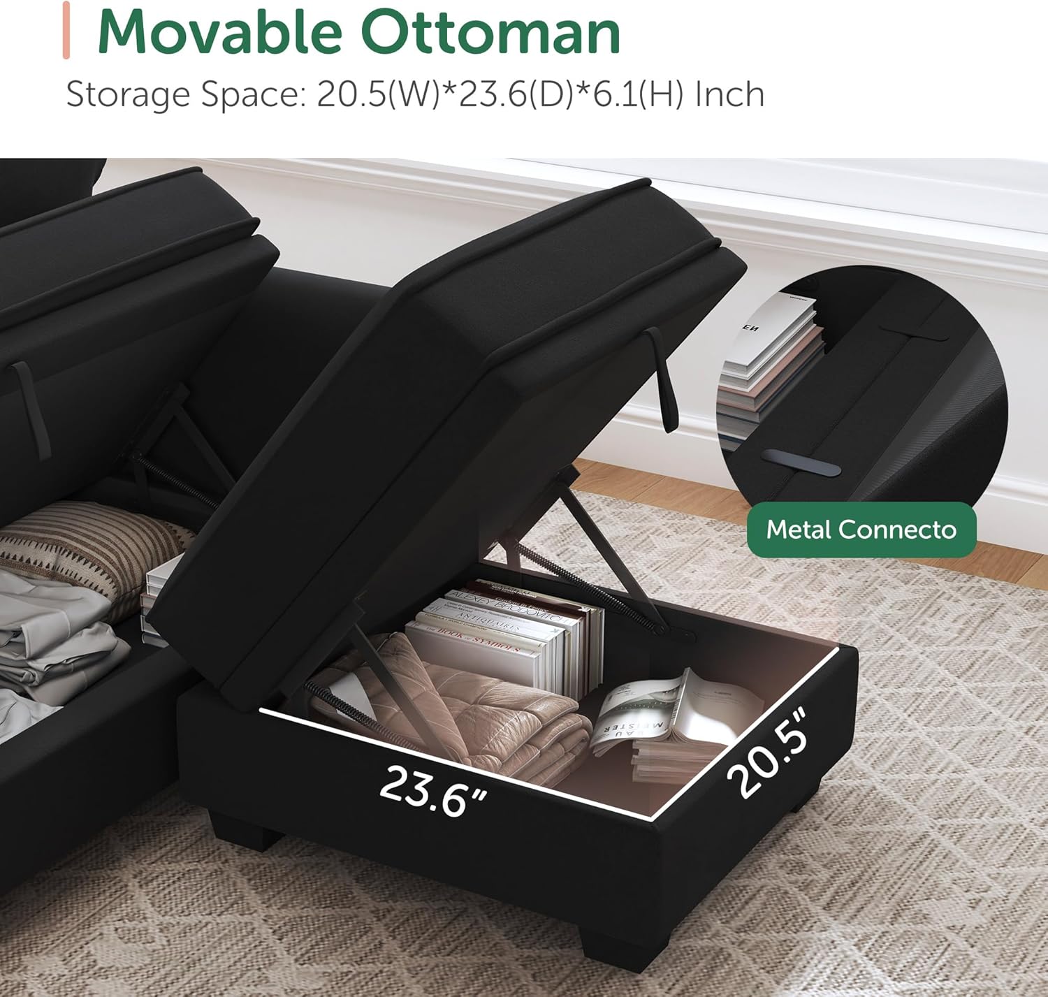HONBAY Sectional Sofa with Storage Seat Velvet U Shaped Couch with Reversible Chaise Convertible Sectional Couches for Living Room,Black Velvet