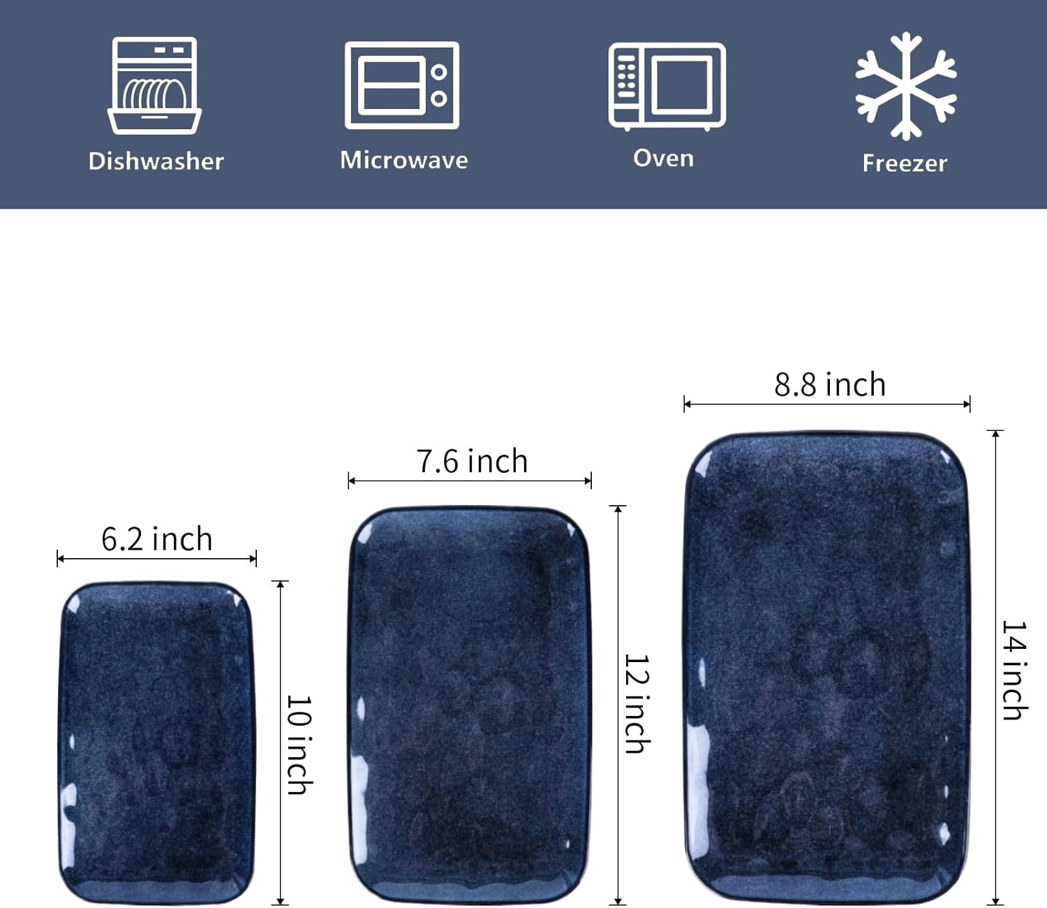 vicrays Ceramic Rectangle Serving Platters - 14" 12" 10" Porcelain Serving Trays Plates for Party BBQ Appetizers Sushi Dessert - Microwave Oven and Dishwasher Safe - Set of 3 Blue