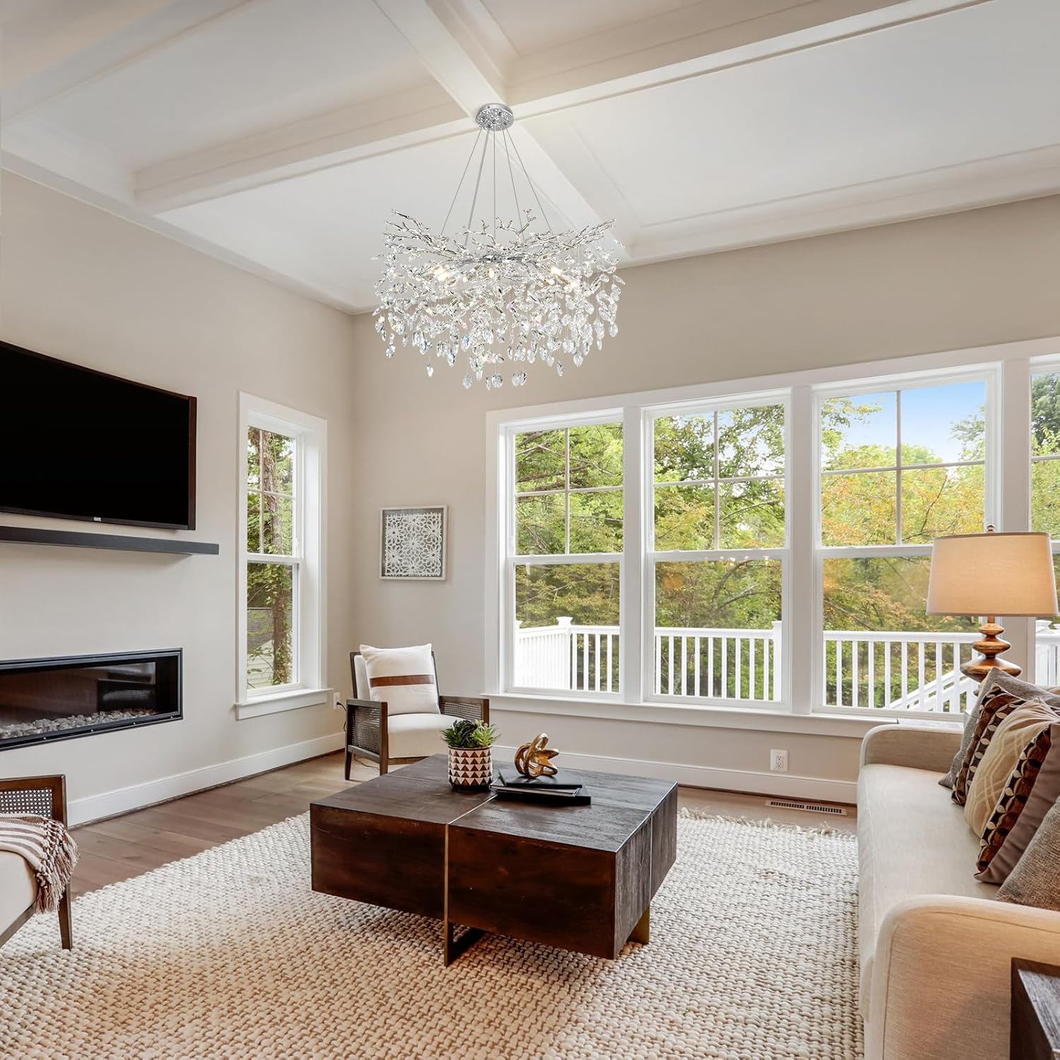 - Application Space:This Round Crystal Chandelier Is Like A silver Tree, It Can Light And Warm The Whole House, And It Is Also A Great Decorative Light. The Ceiling Canopy Of The Chandelier Is Compatible With Both Flat And Sloped Ceiling Installations, So It'S Perfect For Dining Room, Living Room, Kitchen Island, Bedroom And Any Other Space.