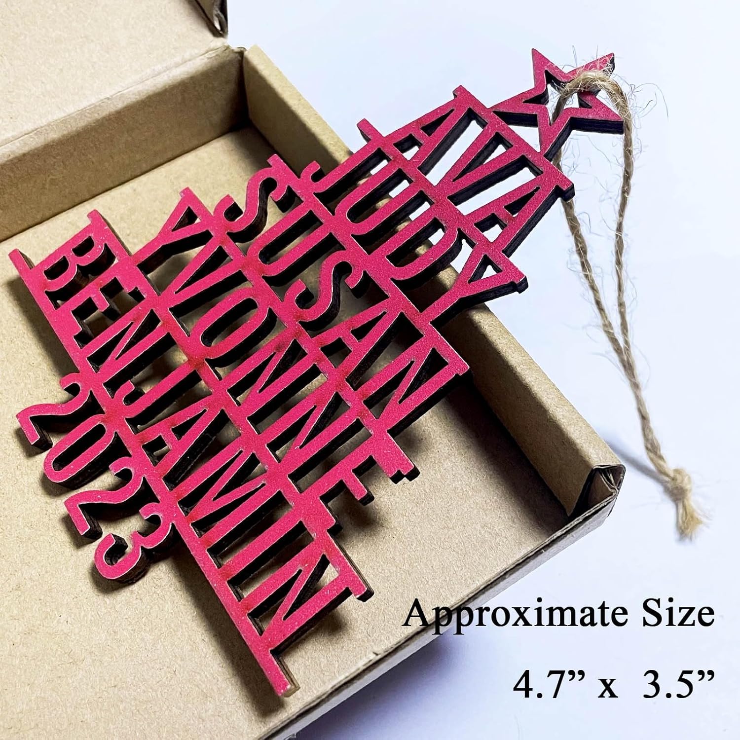 • Perfect Size And Easy To Hang-Measuring at 5.9" x 3.9",this ornament is the ideal size to adorn your Christmas tree. PS:The name will be rearranged from longest to shortest to make the Christmas tree shap.