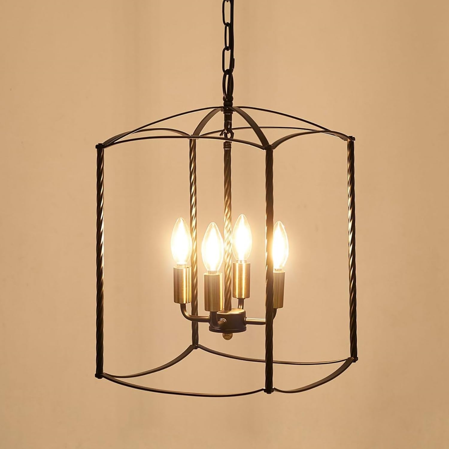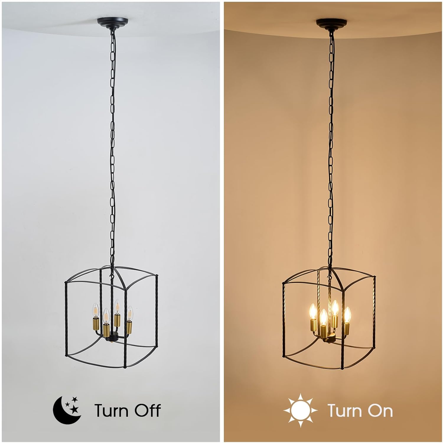 Farmhouse 4 Lights Pendant Light, Industrial Black Lantern Chandelier with E12 Gold Base Metal Cage Rustic Geometric Hanging Light Fixtures for Kitchen Island Foyer Entryway Dining Room