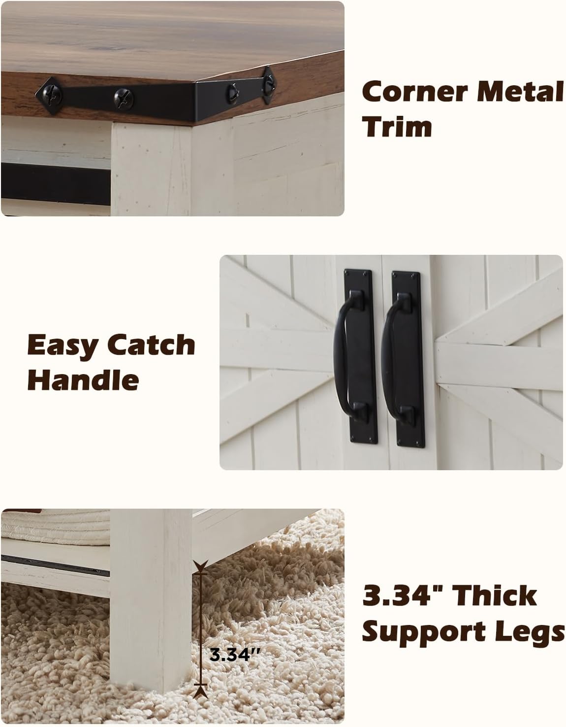 - Elevate your Living Room: This farmhouse coffee table with storage bundles functionality and farm aesthetics into one. Features classic barn door and unique farmhouse wood grain finish, adding a touch of rustic charm and cozy natural vibes to your space. The corner metal trim adds more exquisite. Not only keeps the living room neat and tidy but complements the surrounding furniture and decor, feels inviting and welcoming, gathers the family around, and enjoy the warmth and intimate ambiance