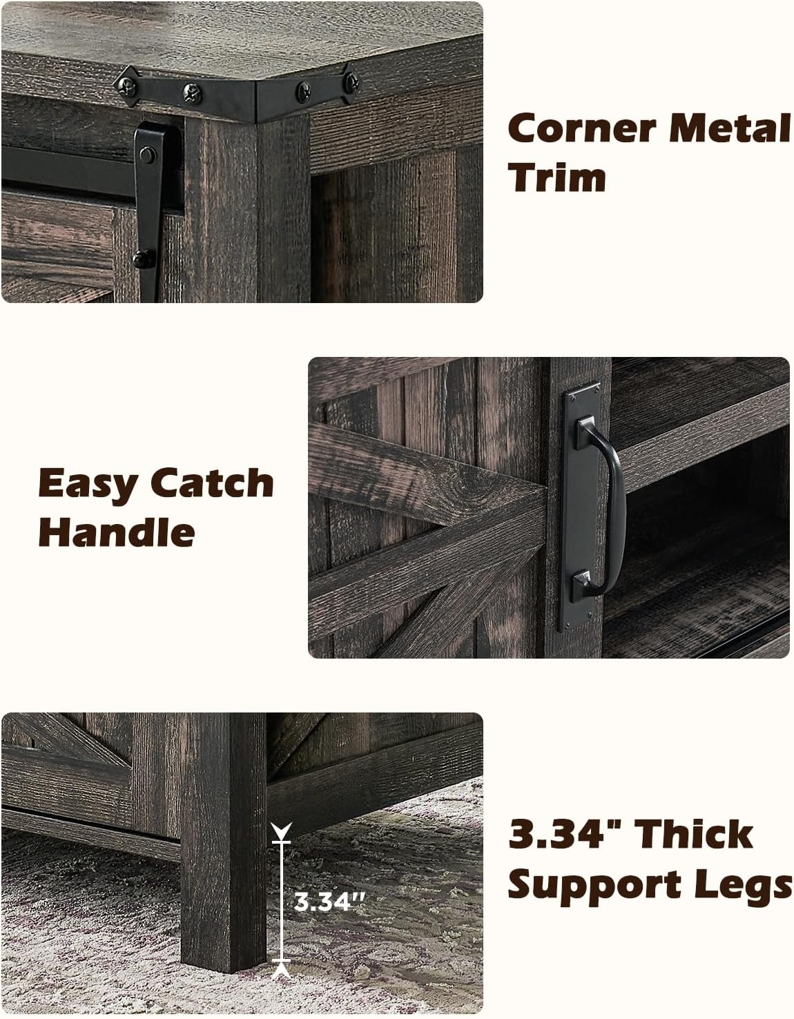 - Elevate your Living Room: This farmhouse coffee table with storage bundles functionality and farm aesthetics into one. Features classic barn door and unique farmhouse wood grain finish, adding a touch of rustic charm and cozy natural vibes to your space. The corner metal trim adds more exquisite. Not only keeps the living room neat and tidy but complements the surrounding furniture and decor, feels inviting and welcoming, gathers the family around, and enjoy the warmth and intimate ambiance