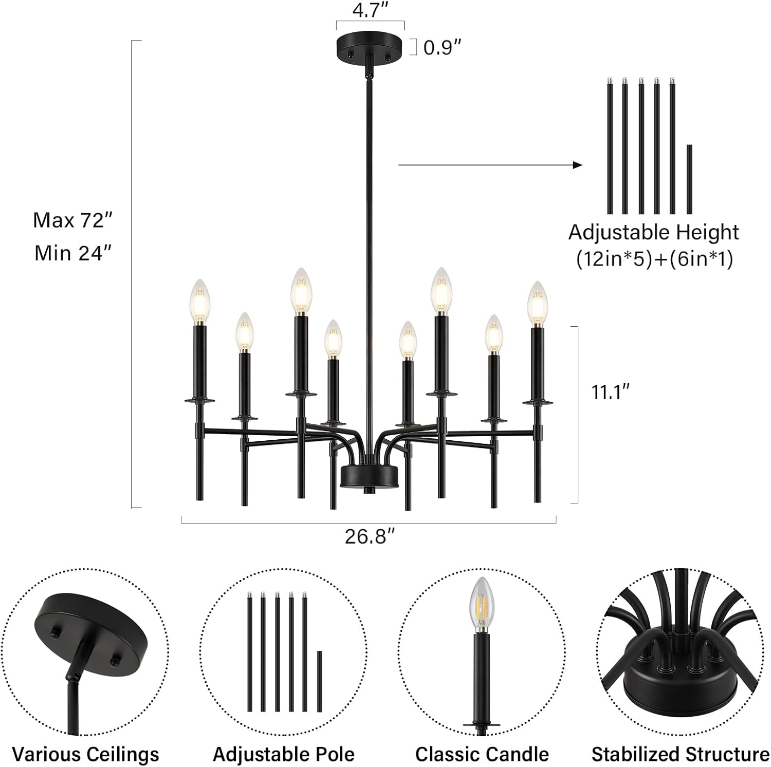 - Long Height Adjustable & Various Ceilings: Designed for versatility, the ZUYURT chandelier's adjustable poles (24 to 72 inches) and flexible canopy make it perfect as entryway chandeliers for high ceilings, and also suitable for living room chandelier in spaces with lower ceilings, including sloped surfaces. This black chandelier light fixture integrates seamlessly into any room, providing a adaptable solution for dining room chandeliers over table black or as a kitchen chandelier