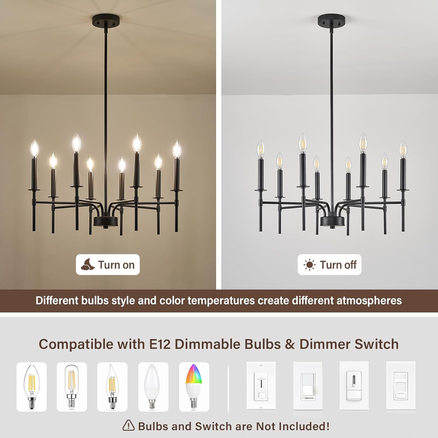 - Dimmable and E12 Bulb Compatibility: With 8 E12 candelabra sockets, this black chandelier is compatible with various E12 bulbs (incandescent, LED, CFL, and halogen, 40W MAX / bulb), offering dimmable functionality to create the perfect ambiance. This black matte chandelier allows for flexible lighting control, making it suitable as a black chandeliers for dining room, or master bedroom chandelier (NOTE: bulbs and dimmer are NOT included)
