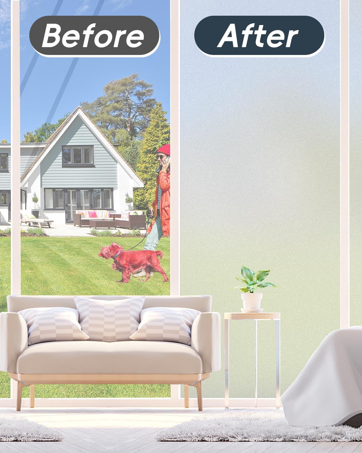 - Enjoy Privacy & Soft Light: Our frosted glass window film ensures your privacy by creating an elegant frosted glass effect, preventing prying eyes from seeing inside while still allowing comfortable natural light to fill your space, ideal for office, bathroom window privacy film day and night, or any room where privacy is desired but soft light is also needed.