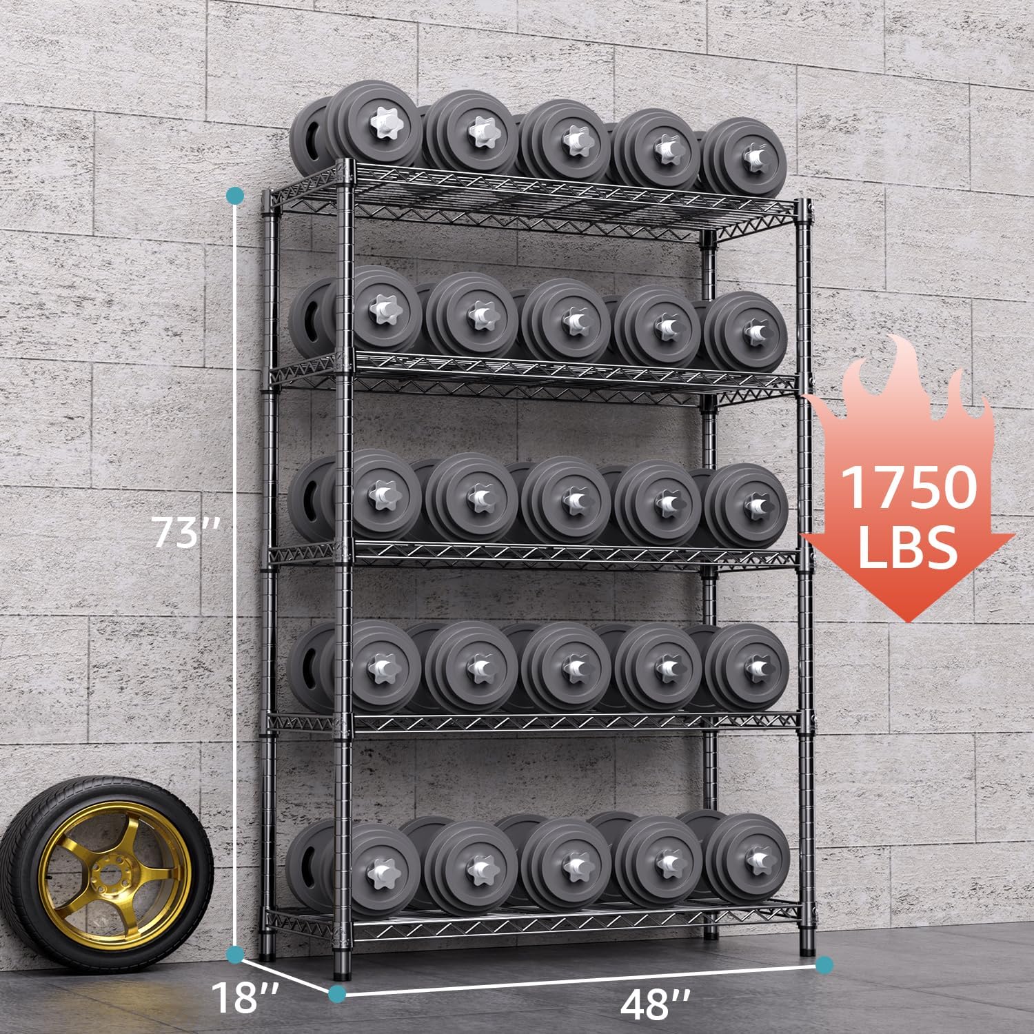- ăSTABLE AND DURABLEăCrafted from premium Carbon Steel and reinforced with 22.22mm pipes, this wire shelving unit (17.7"D x 47.2"W x 72.3"H ) ensures stability. Each shelf showcases a weight-bearing capacity of 350 pounds, while the entire unit can support up to 1750 pounds.