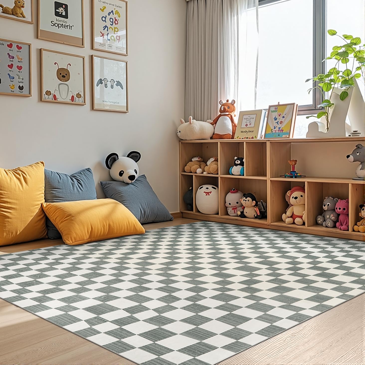 jinchan 6x9 Checkered Area Rugs for Kids Room - Machine Washable Soft Rug Modern Geometric Lattice Non-Slip Carpet for Nursery Playroom Classroom Living Room Bedroom Dining Room Home Office Grey