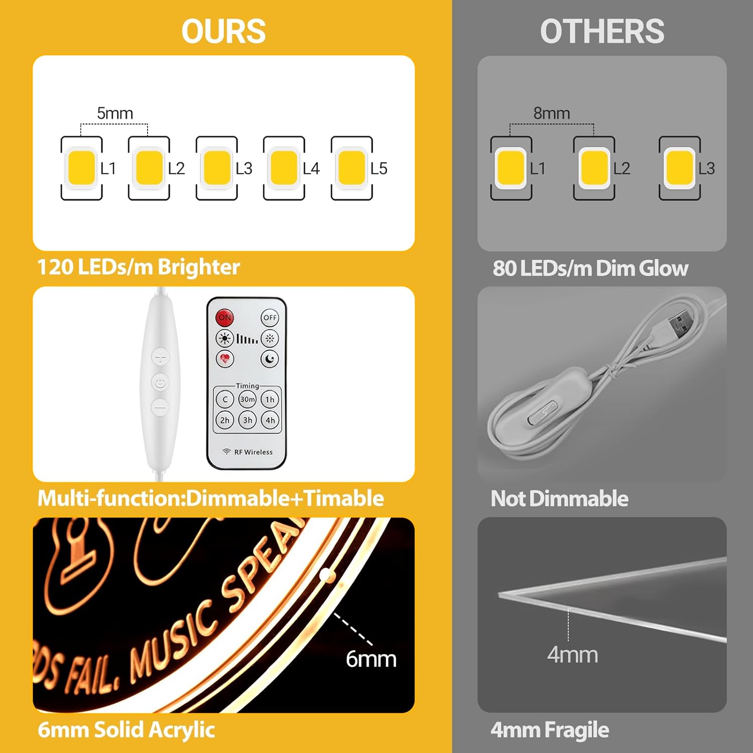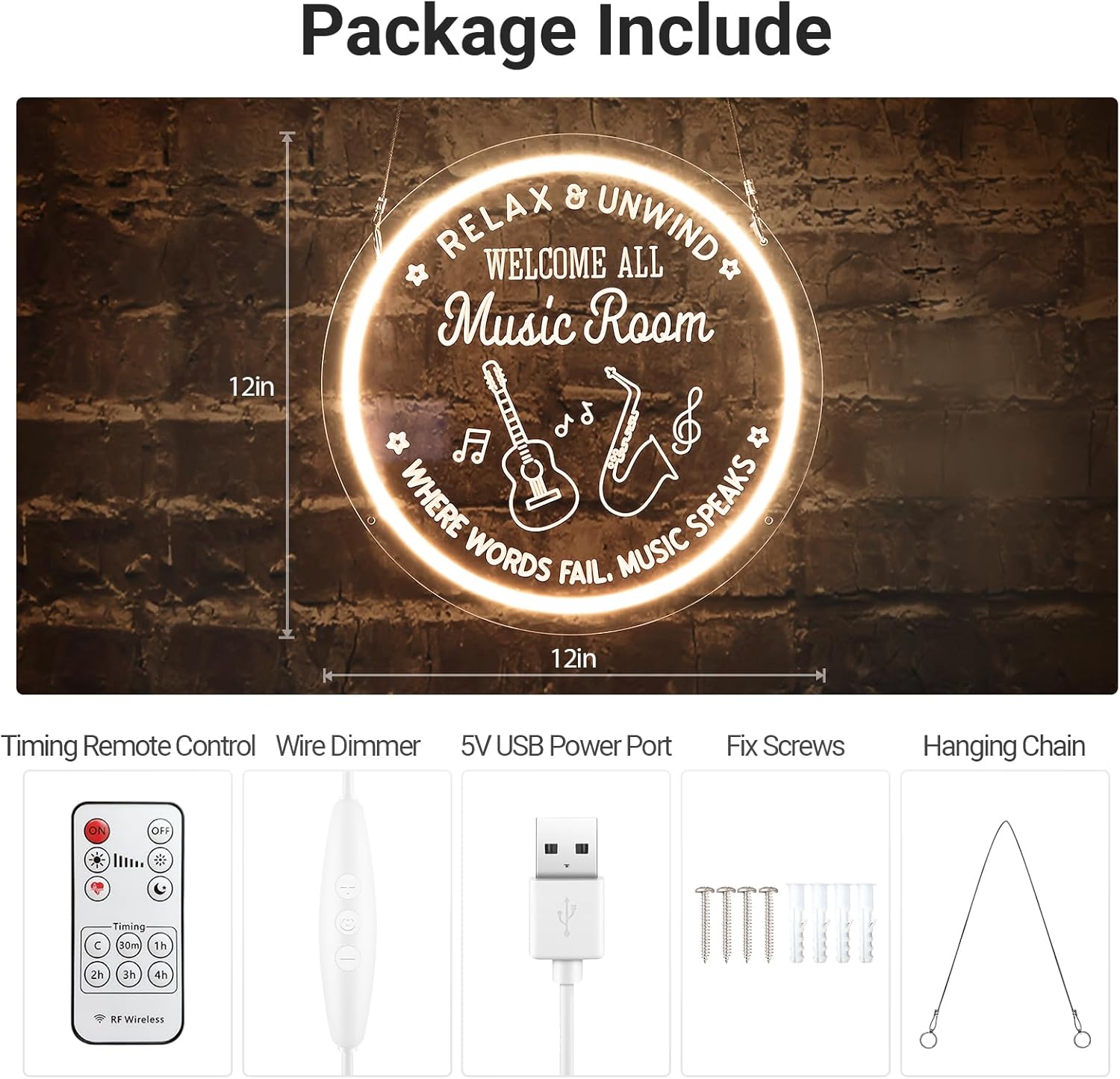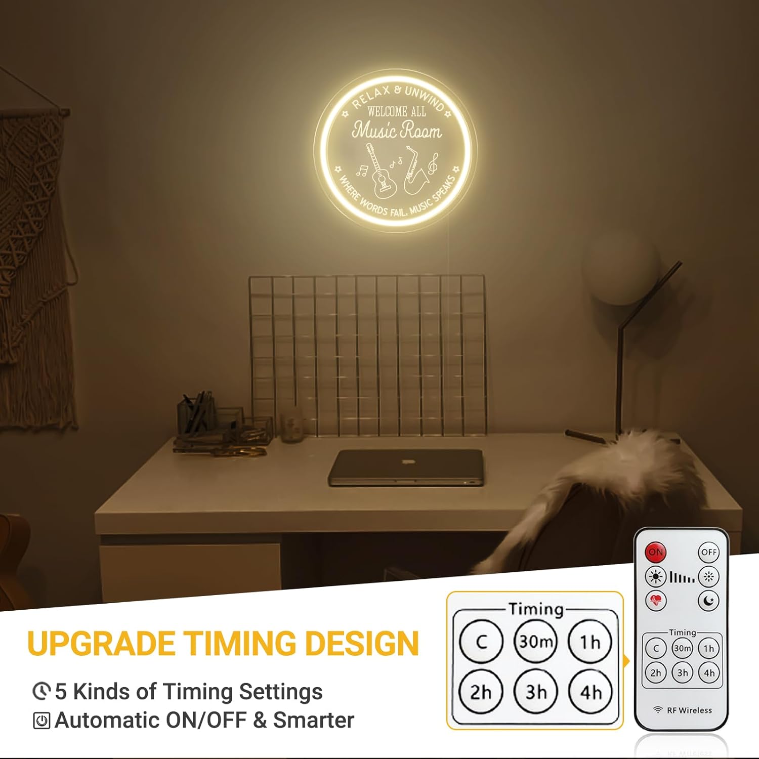 - ăOriginal Timing FunctionăThe music room neon sign adopts the latest timing control design with 5 timing modes of 0.5 H/1 H/2 H/3 H/4 H. It also has stepless dimmable mode and multiple dimming modes. You can arbitrarily adjust the brightness and set the mood for any occasion, whether it's a romantic dinner, a party, or just relaxing at home. More convenient & save energy.