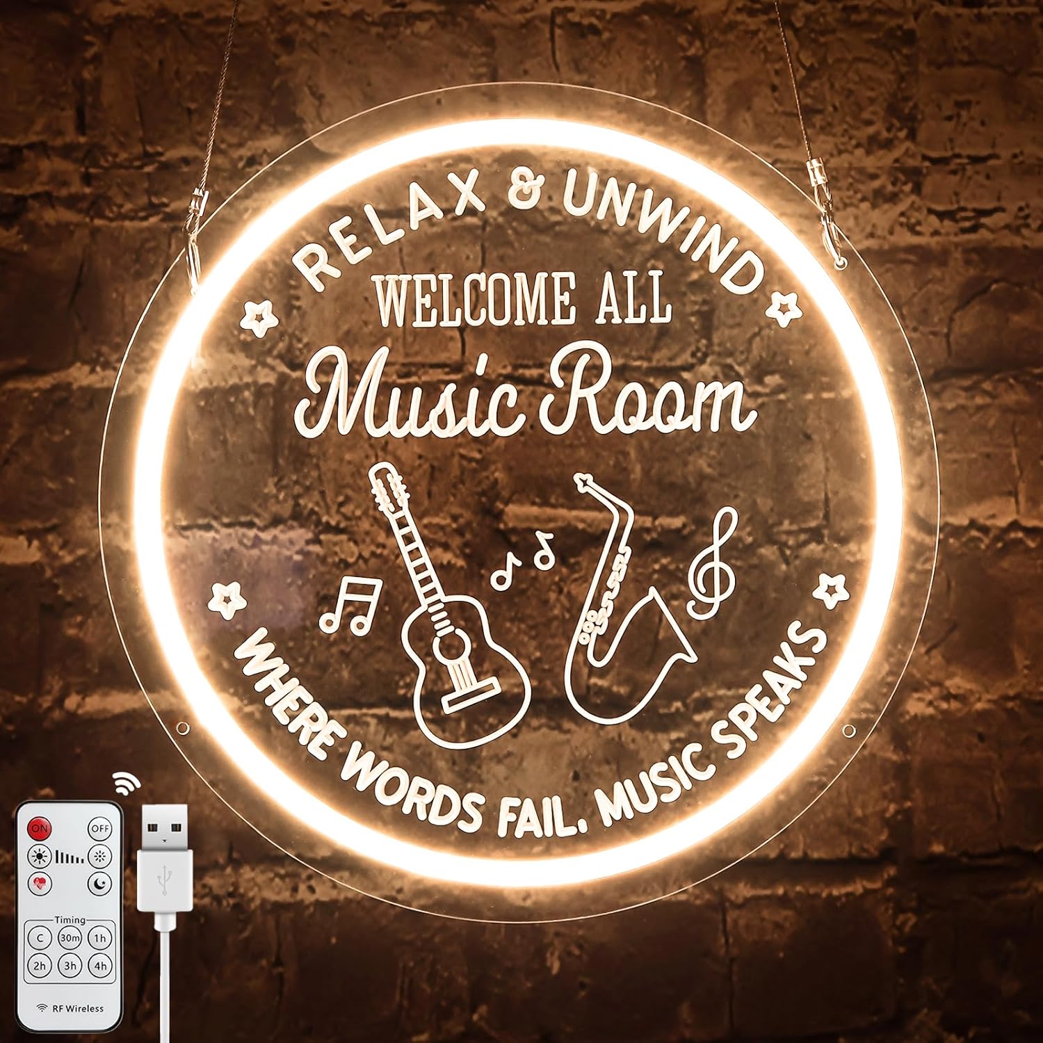 - ăDecor Your RoomăUse this Music Room Neon Sign in your room to create a unique atmosphere and make a wonderful addition. It's a really nice mood light and it definitely adds flavor to an otherwise plain room. This led neon can also be used to decorate many scenes, such as studioes, dorms, living room, home bars, game rooms, man cave, offices, shops and so on.