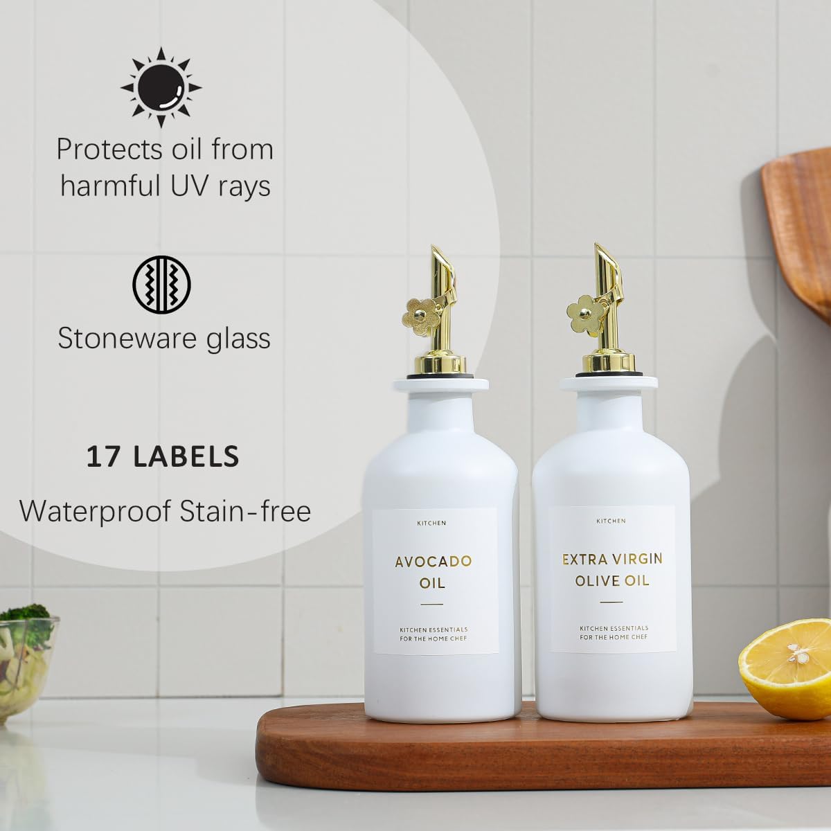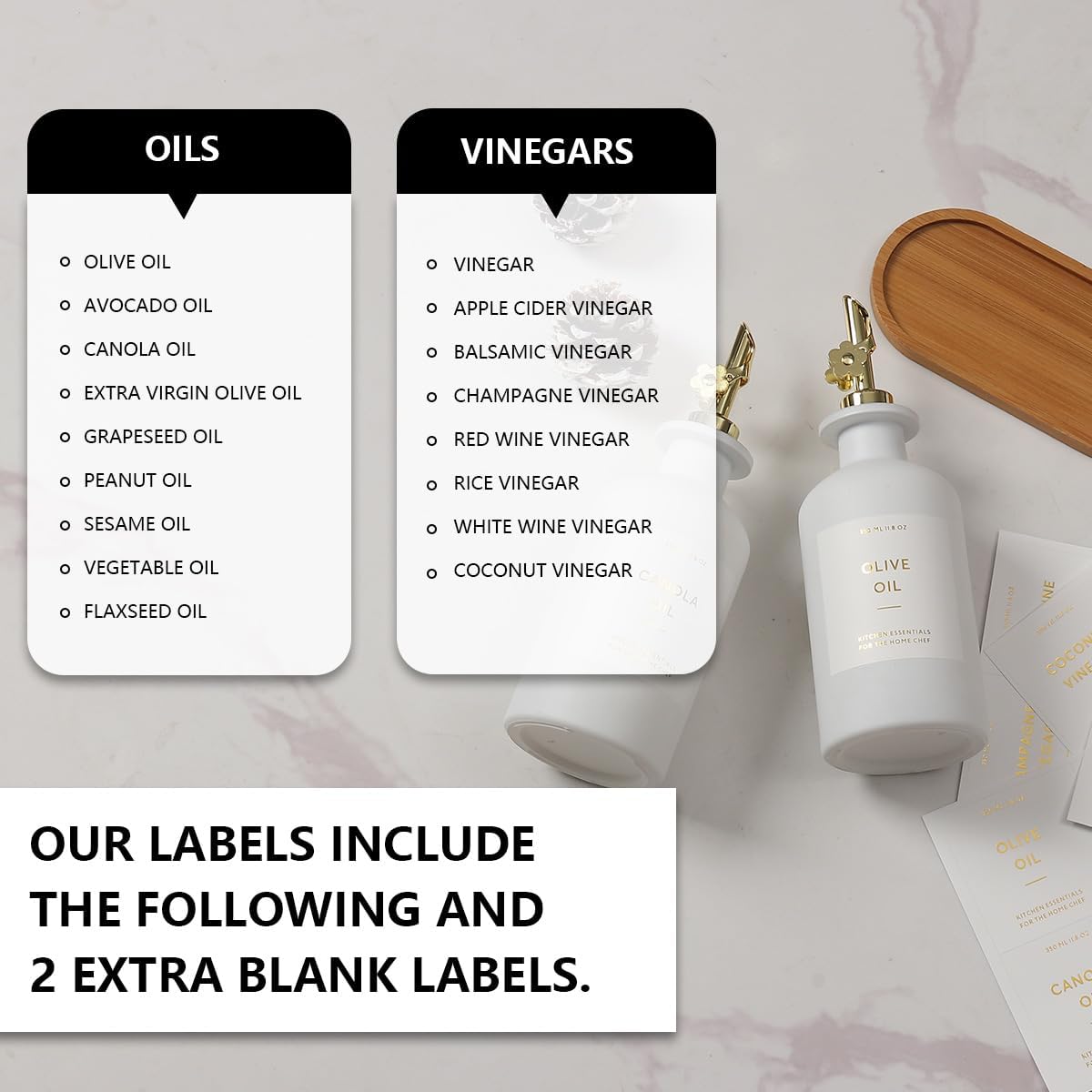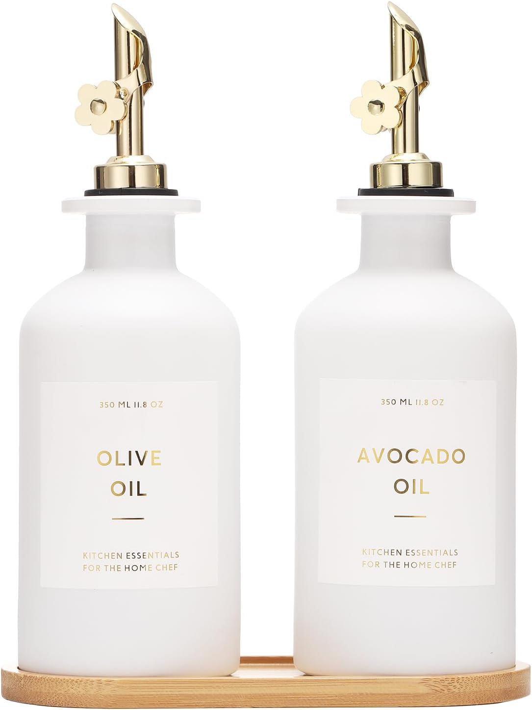 • KITCHEN OLIVE OIL DISPENSER BOTTLES – The oil and vinegar dispenser set contains 2 white 11.8oz (350ML) glass bottles, 2 gold stainless steel oil spouts, 17 waterproof labels(kinds of oil and vinegar) and a bamboo tray, Ideal for safely store and dispense your olive oil and vinegar.
