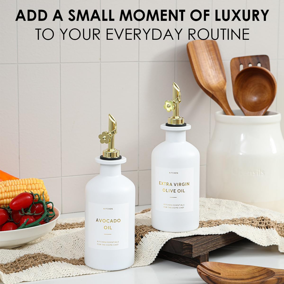 • KITCHEN ESSENTIAL - Worthy of sitting on your kitchen counter, The olive oil bottle dispenser for kitchen with label which can help you identify them easily, both decorative and practical, this oil dispenser bottles not only kitchen oil dispenser, but also black and white kitchen décor.