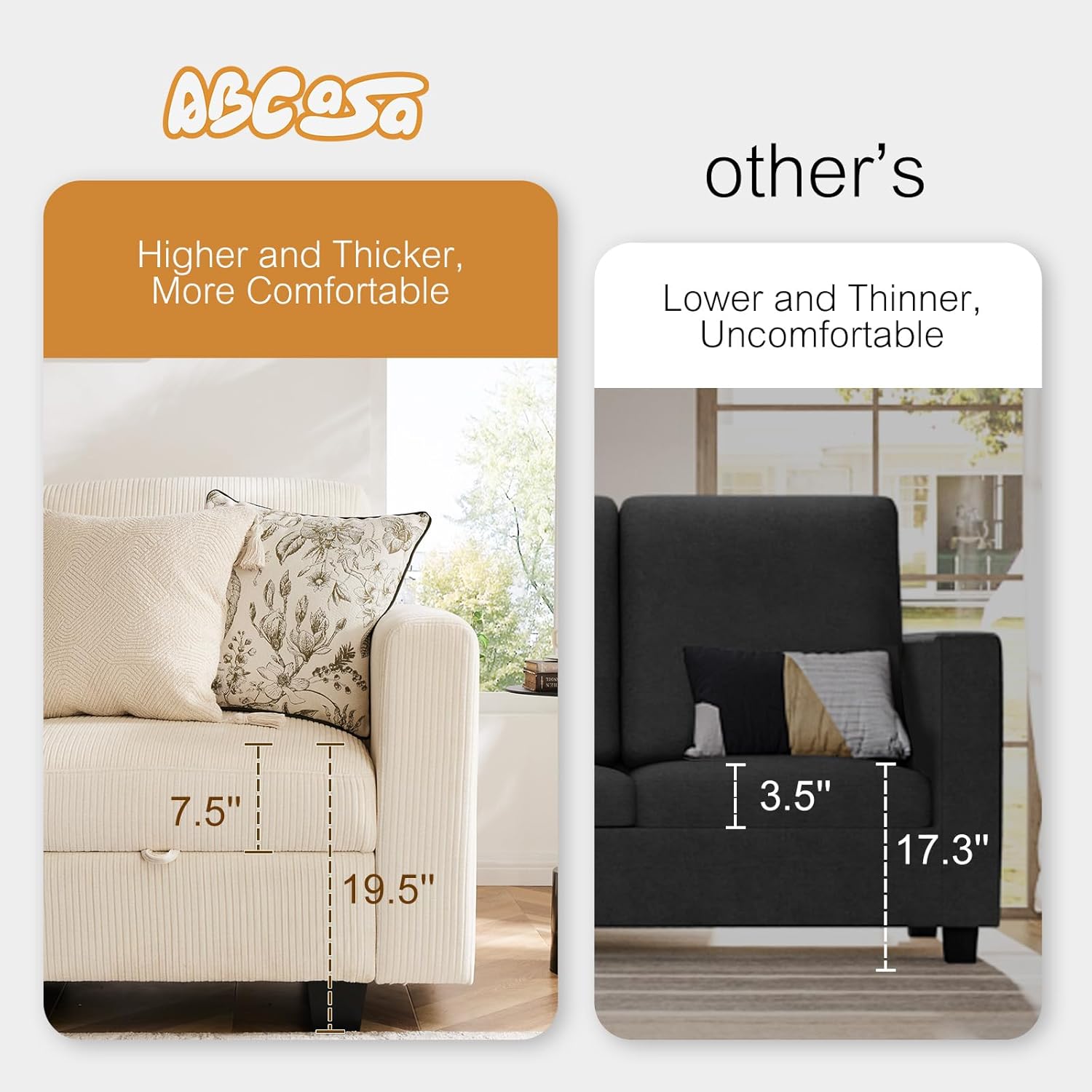 - THICKER CUSHION & COMFORTABLE FABRICS:The thickness for seat cushion is 7.5 inches. The inside is made of high-quality foam and spring padding, providing both support and comfort. The outside is made of imitation linen, which is skin-friendly, breathable, and resistant to pilling and fraying. Seat firmness: medium. On a scale from 1 to 5 (5 being the firmest), it's a 3.