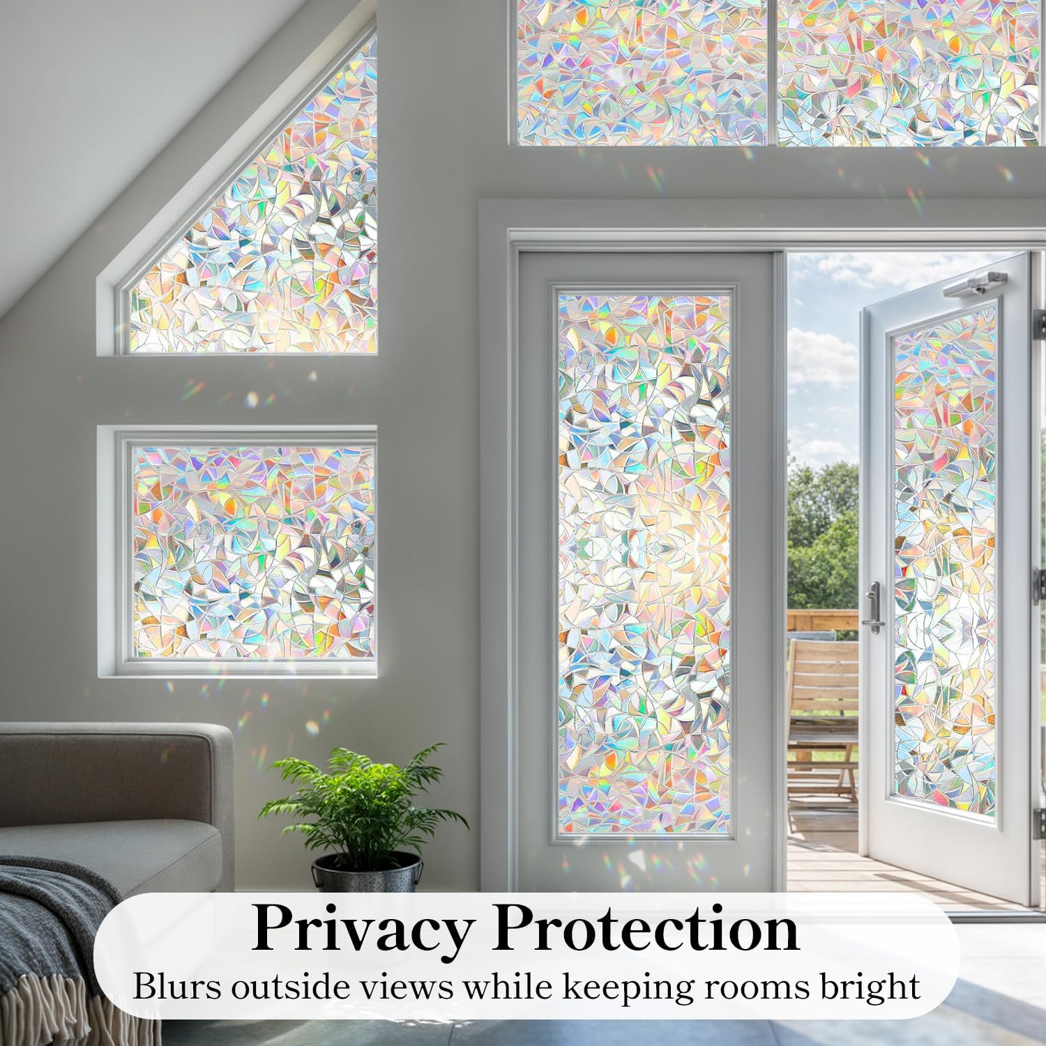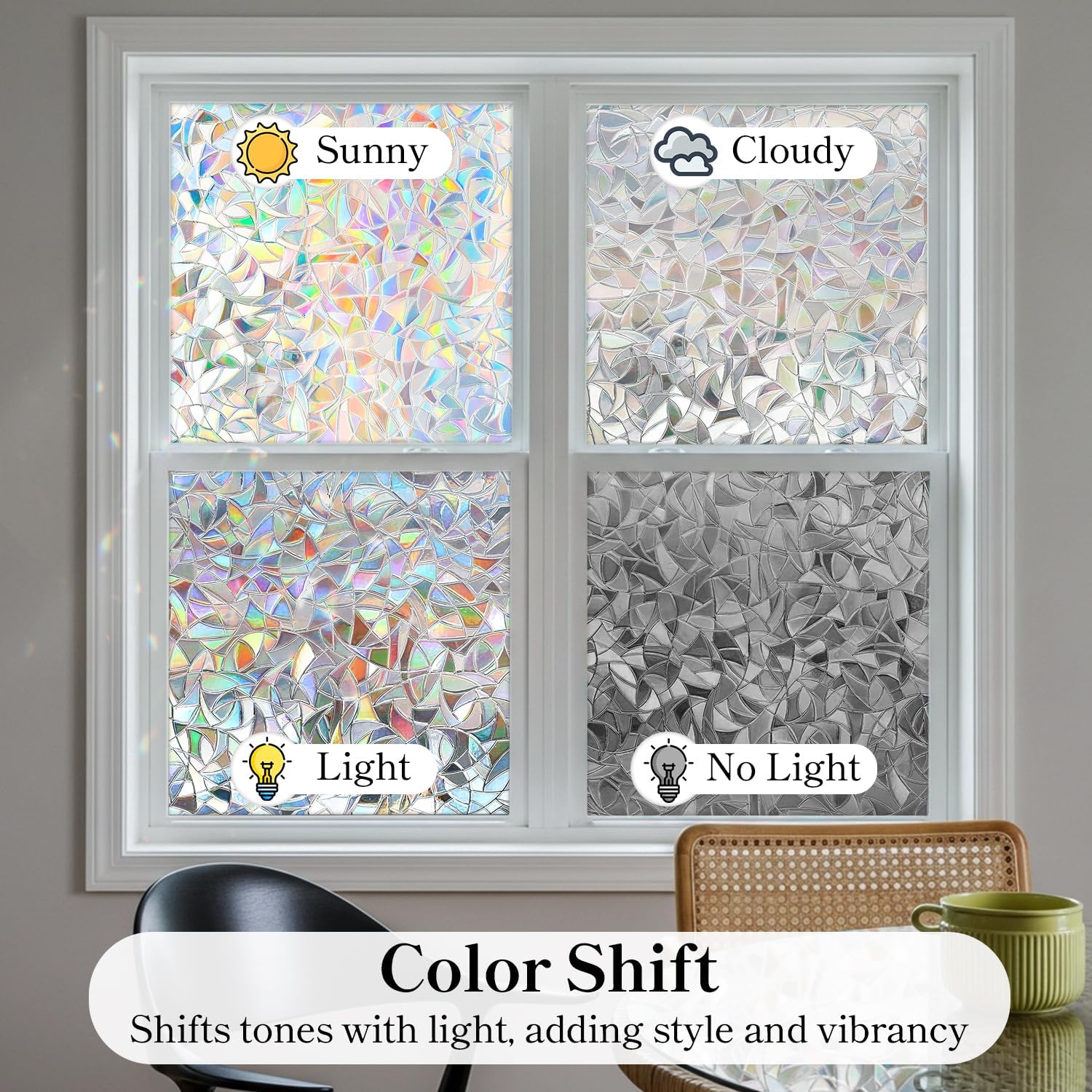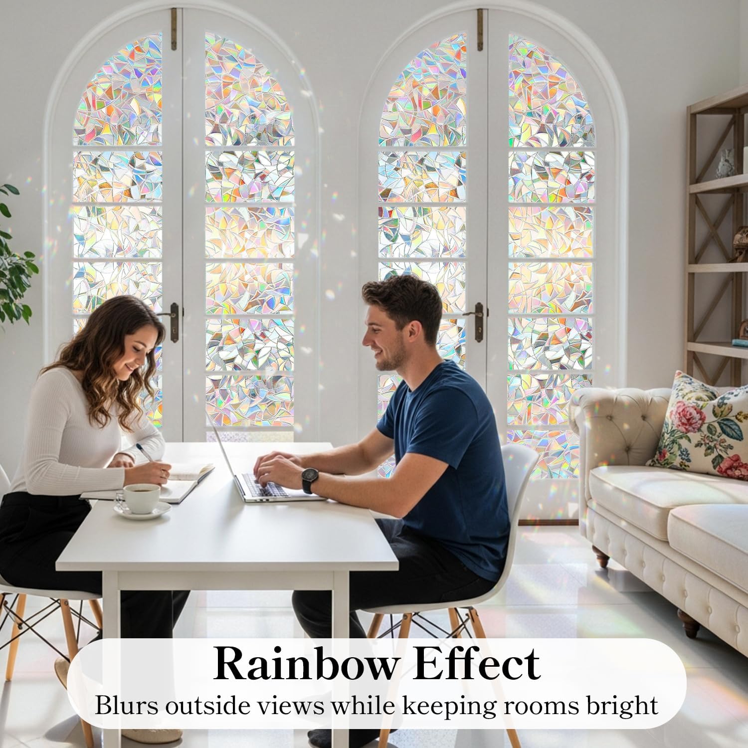 - 【Beautiful Rainbow Effect】The surface of the window privacy film is made with advanced 3D laser technology. When sunlight shines on the window film, the window film will produce a beautiful rainbow effect, making your window film look like a work of art for you. Adds beauty to interior spaces, upgrades your home decor, and is an economical and convenient alternative to curtains and blinds. Note: The privacy window film itself is white and translucent, the rainbow effect only appears under light.