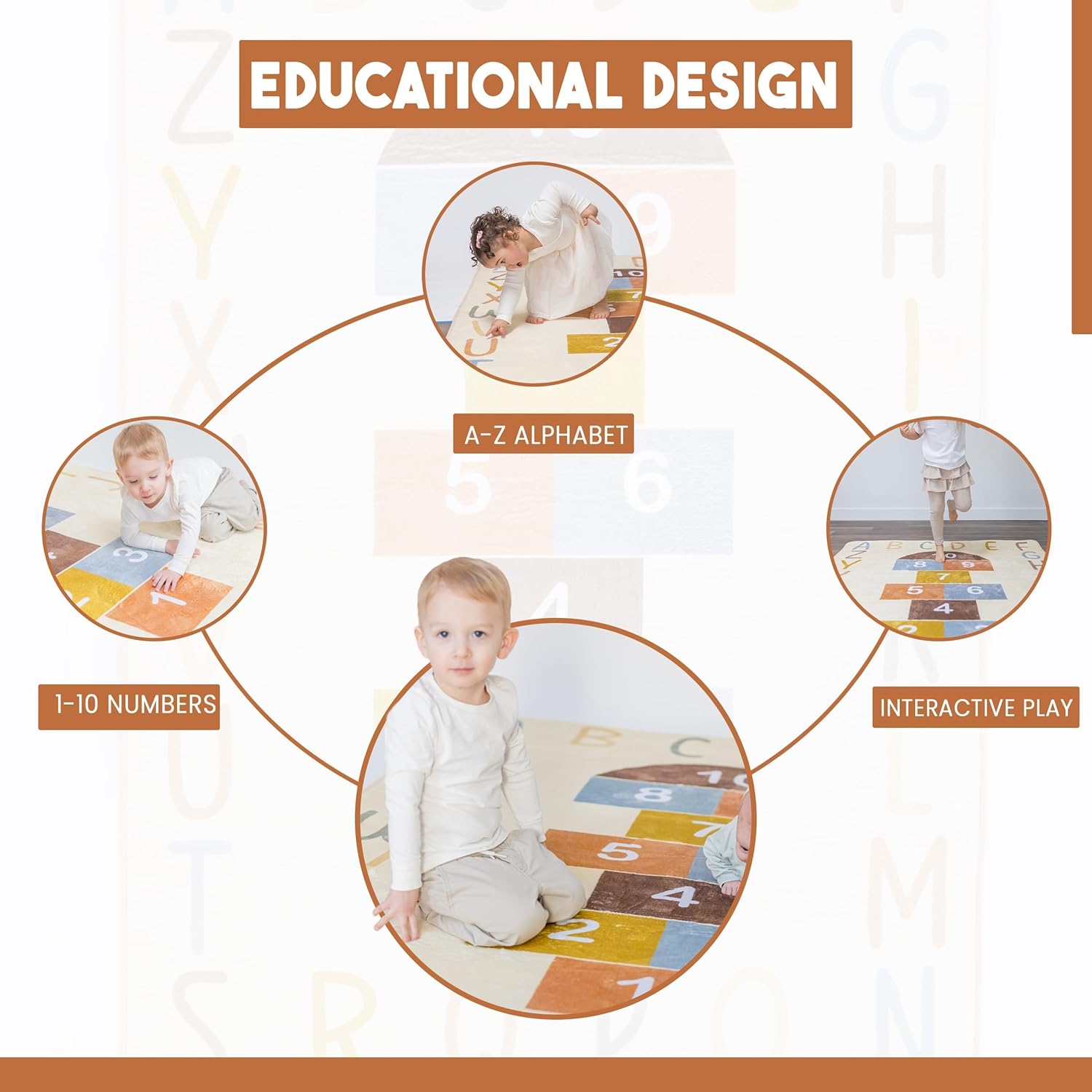 - šš„šš², šššš«š§ šš§š šš«šØš° ššØš ššš”šš«: Did you know our kids playroom mat with A-Z alphabet and 1-10 numbers offers much more than just hopscotch? The learning opportunities are endless! Challenge your kids with basic math problems, spelling words, identifying numbers and letters, and even participating in yoga activities. See how many colors you can stretch to the possibilities are endless. Whether you homeschool or not, these boho classroom rug will exceed your expectations and provide a fun, educational environment for your little ones.