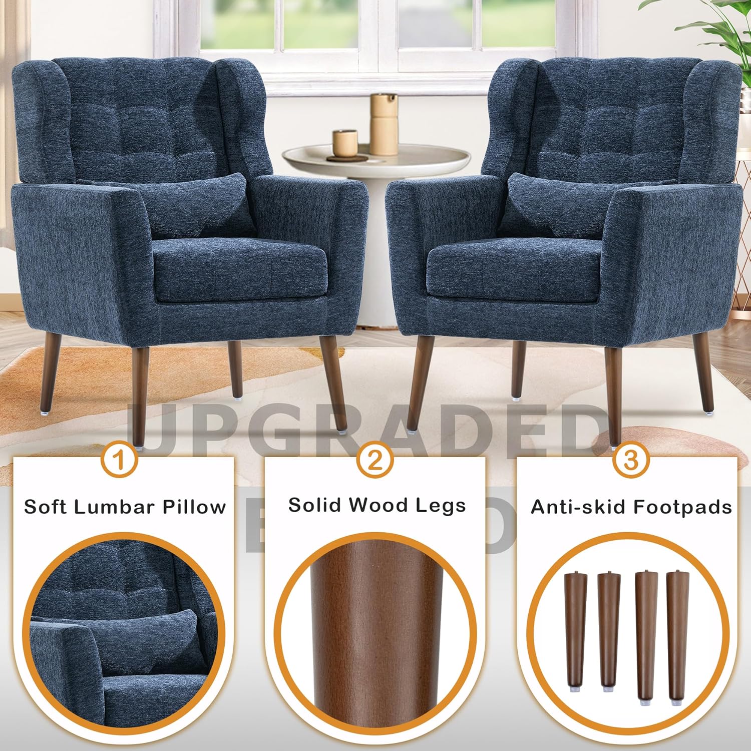 Modern Accent Chair, Upholstered Armchair with Pillow, Fabric Single Sofa Chair with Lounge Seat and Wood Legs Accent Chair for Living Room Bedroom Small Spaces (Dark Blue)