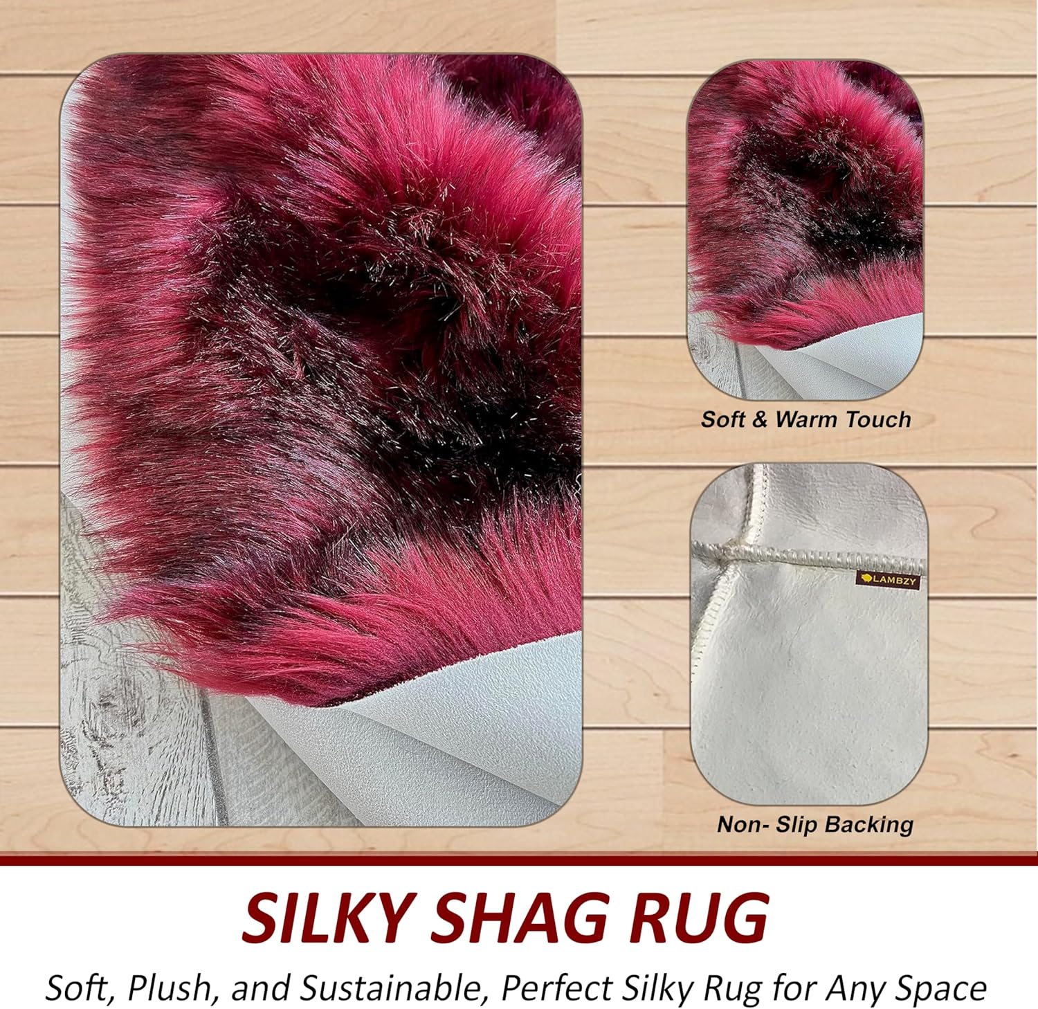 LAMBZY Faux Sheepskin Super Soft Hypoallergenic Free Shape Silky Shag Rug, Luxury Shaggy Plush Carpet for Bedrooms Living Kids Room Sofa Rugs (Burgundy, Double 2'x6')