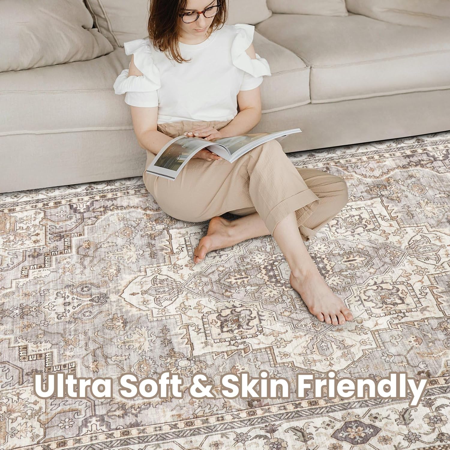 Washable Area Rugs for Living Room - 5x7 Neutral Vintage Distressed Floral Farmhouse Boho Large Soft Floor Rug Indoor Non Slip Carpet for Bedroom Dining Room Office - Grey Brown
