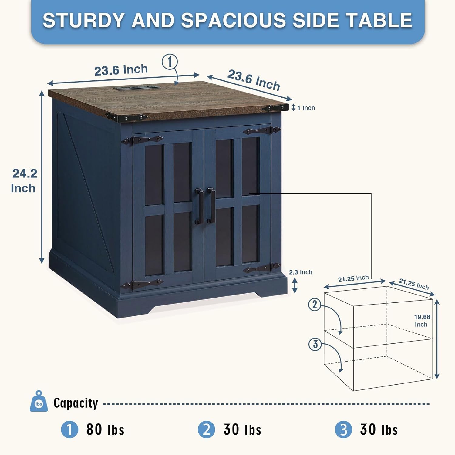 Farmhouse End Table with Charging Station,24" Large Sofa Side Table with Glass Barn Door, Rustic Wood Nightstand Bedside Table with Adjustable Storage Shelf for Living Room, Bedroom, Blue