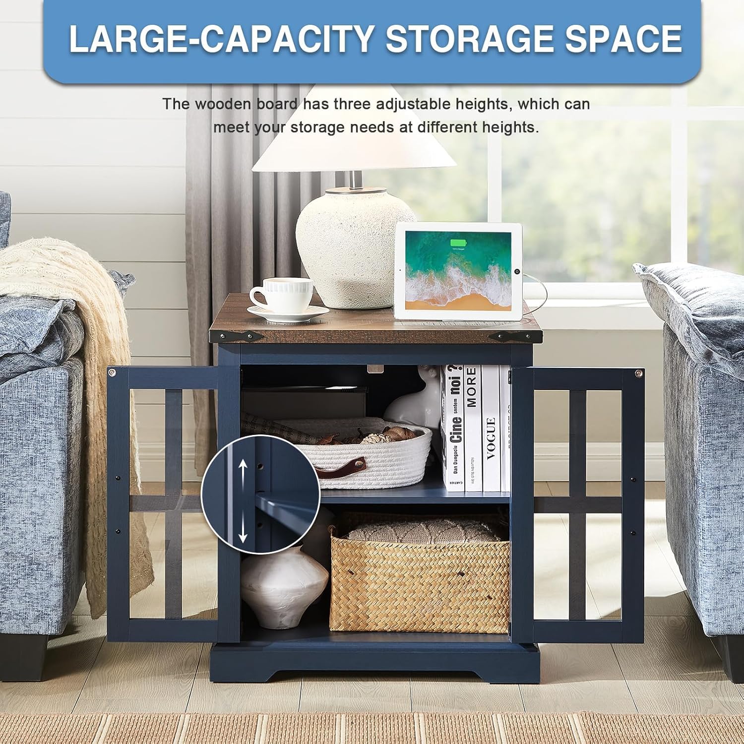 - Large Storage Space : With a spacious tabletop and a extra large storage cabinet, this table provides ample space for storing your essentials.In addition, the shelves in the cabinet are adjustable so you can customize your storage as needed. It can be used as a side table, end table, or nightstand.