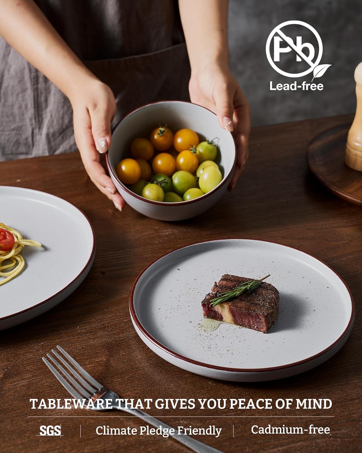 - 【FOOD GRADE NATURAL GLAZE】All of our dinnerware sets are made of food grade glaze. You can safely use them to serve steaks, salads or desserts, no need to worry about any harmful substances leaching into the food.