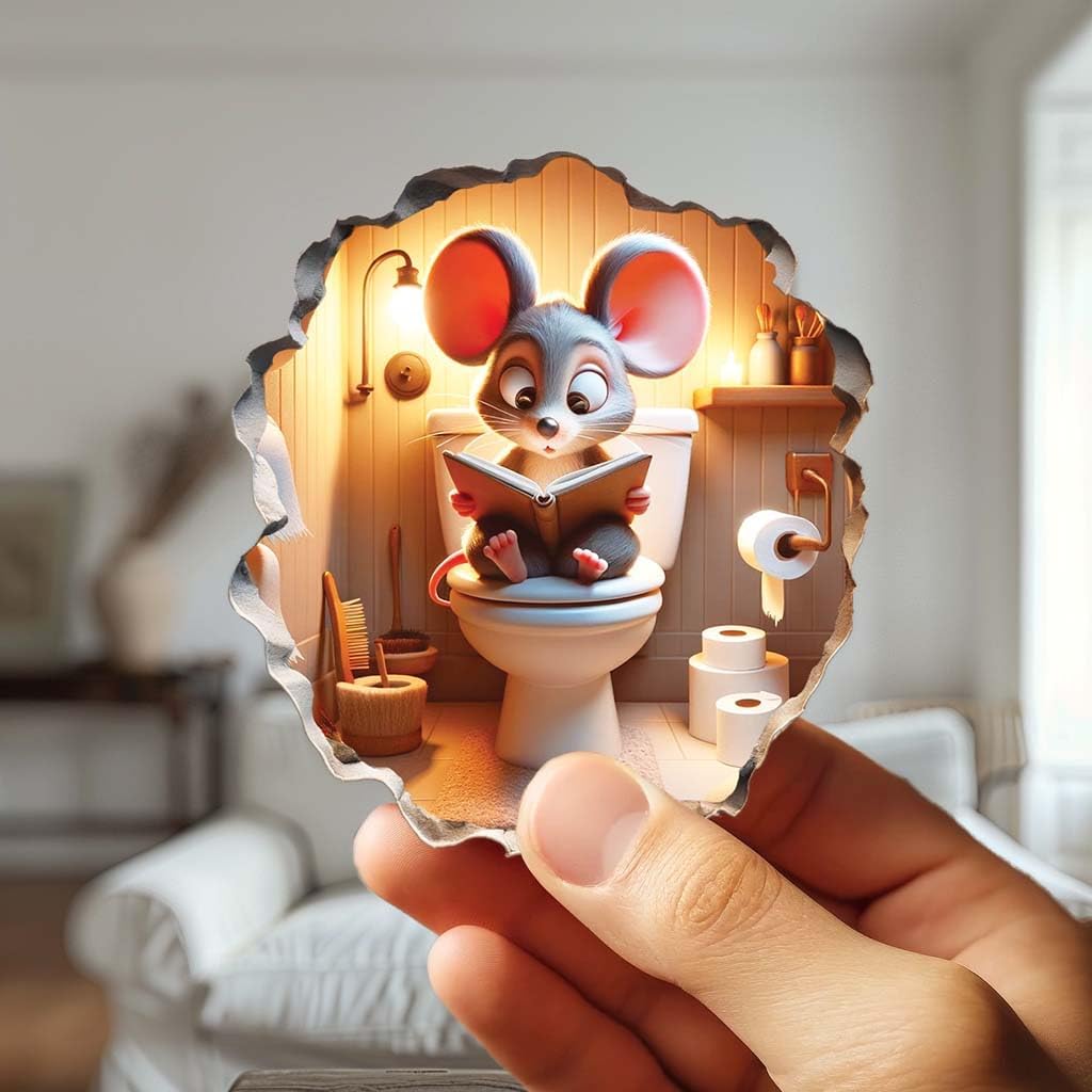 3D Mouse Sitting on Toilet - Mousehole Wall Sticker Decal - Removable Bathroom Decor - Kids Room - Peel & Stick - Whimsical Home Decor - MICESTERPIECE