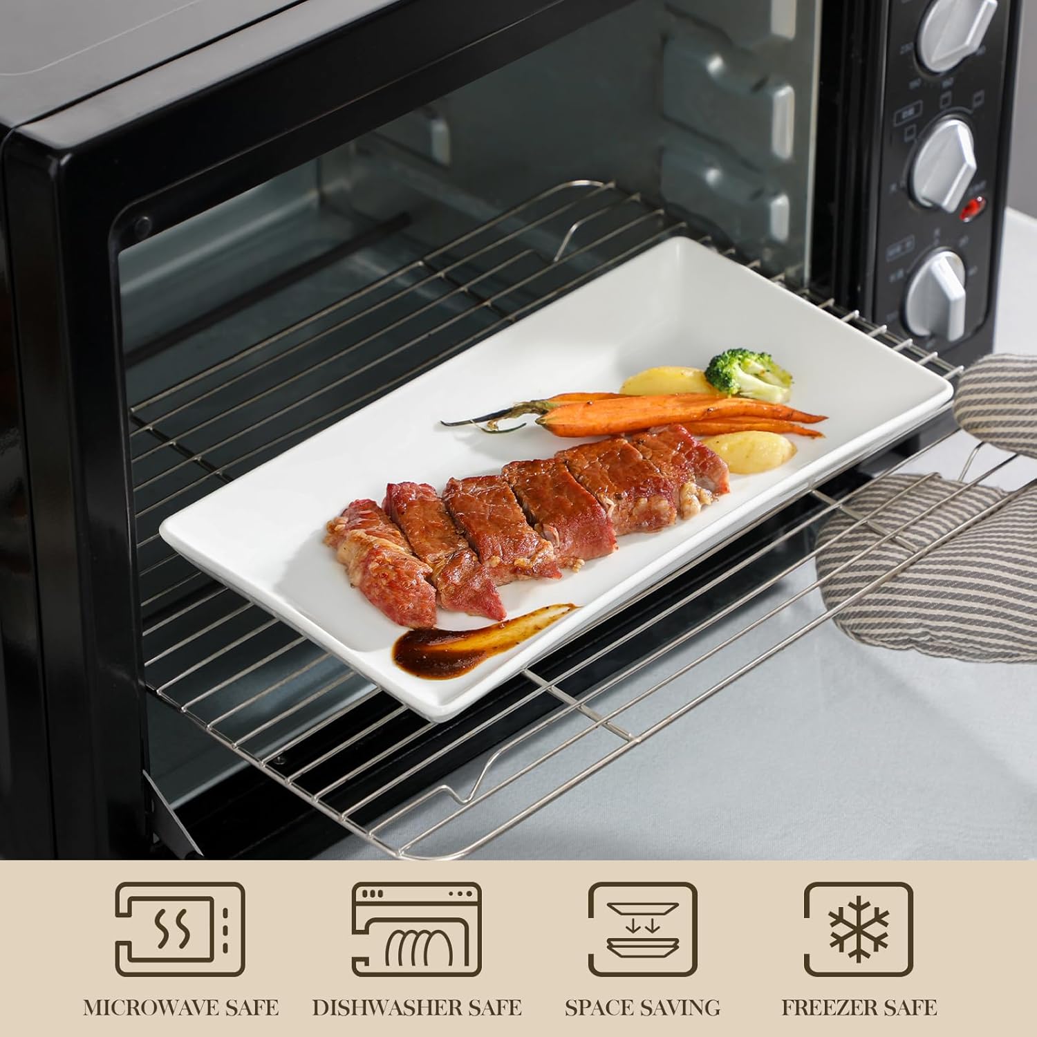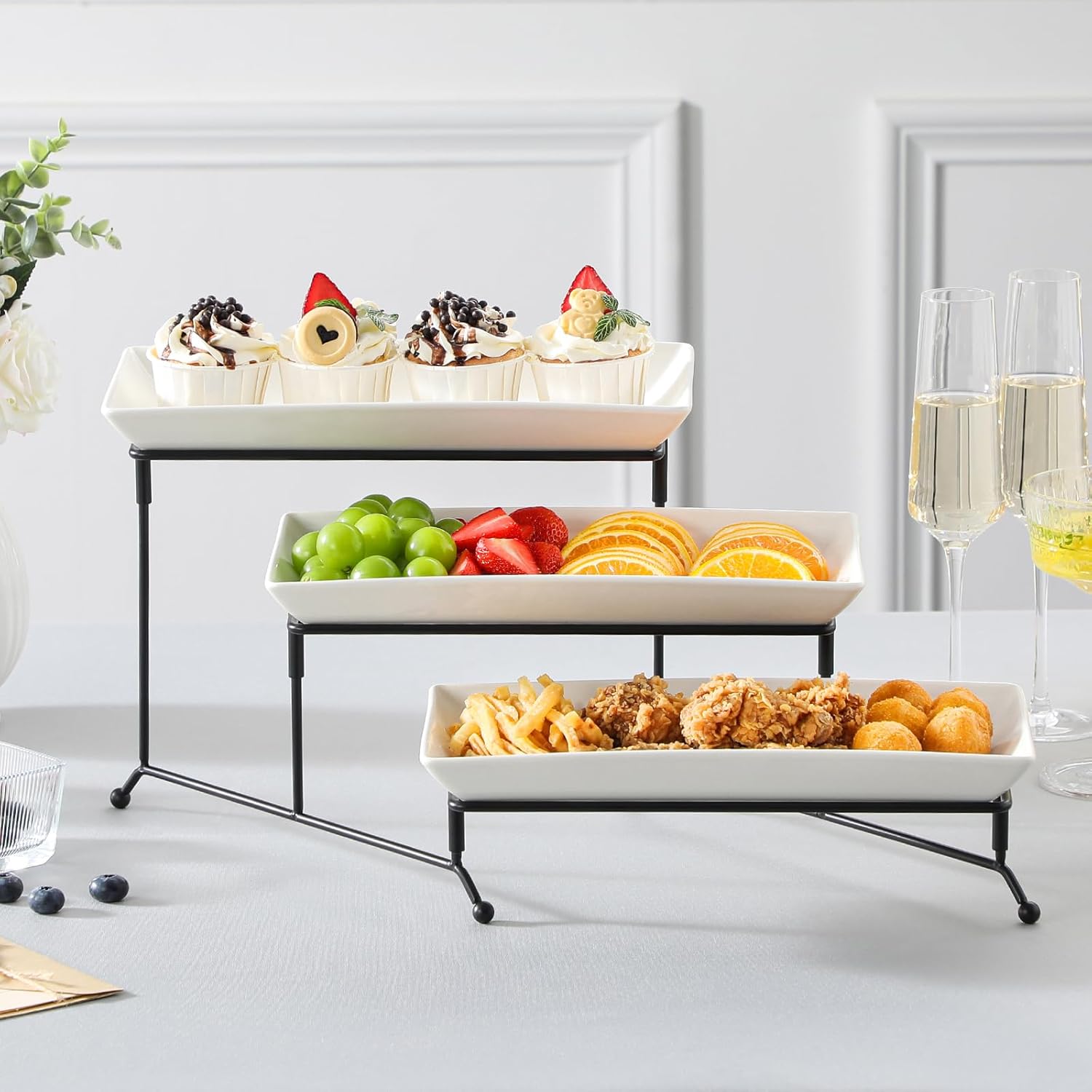 - Sturdy and Stable: Our 12-inch serving tray stand comes with 3 layer sturdy metal stand with three of white rectangular ceramics trays, providing ample space to elegantly present your food and desserts, The black metal rack is robust, and stable,foldable, allowing to flexibly adjust angles and convenient access to food. Our tiered platter stands firm while holding your favorite delicacies. Whether it’s delicate pastries or savory bites, rest assured the serving stand will make your display secure and eye-catching.