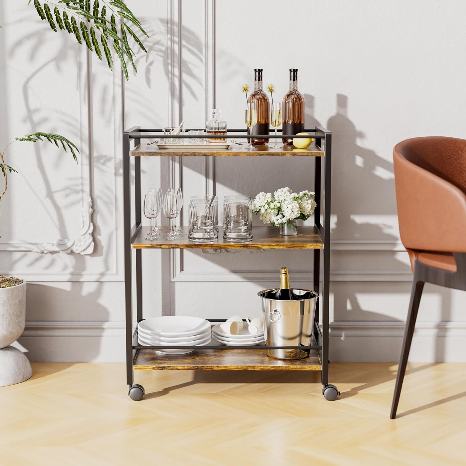 HITNET Bar Cart for The Home, Home Bar Serving Cart with Wheels and Storage Shelves, 3 Tier Rolling Liquor Beverage Cart for Kitchen Dining Living Room, Rustic Brown and Black