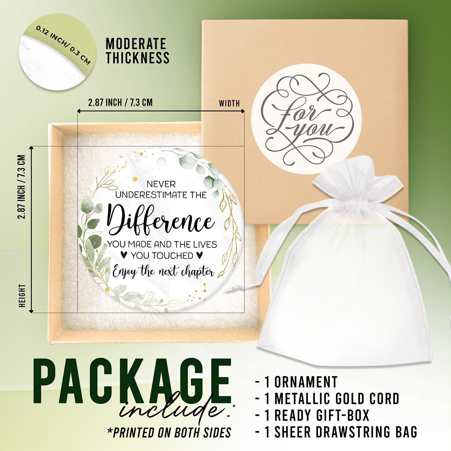 - THOUGHTFUL PACKAGE: Our Ornament comes complete with 1 Two-Sided Ornament, 1 Metallic Gold Cord for easy hanging, 1 Sheer Organza Bag and 1 Gift Box, all meticulously crafted. The two-sided design and attached metallic Gold Cord make it a breeze to hang anywhere from any angle, be it in a classroom or your home. Rest assured, the high-quality brown cardboard box ensures the ornament remains well-protected during transit, avoiding any damage