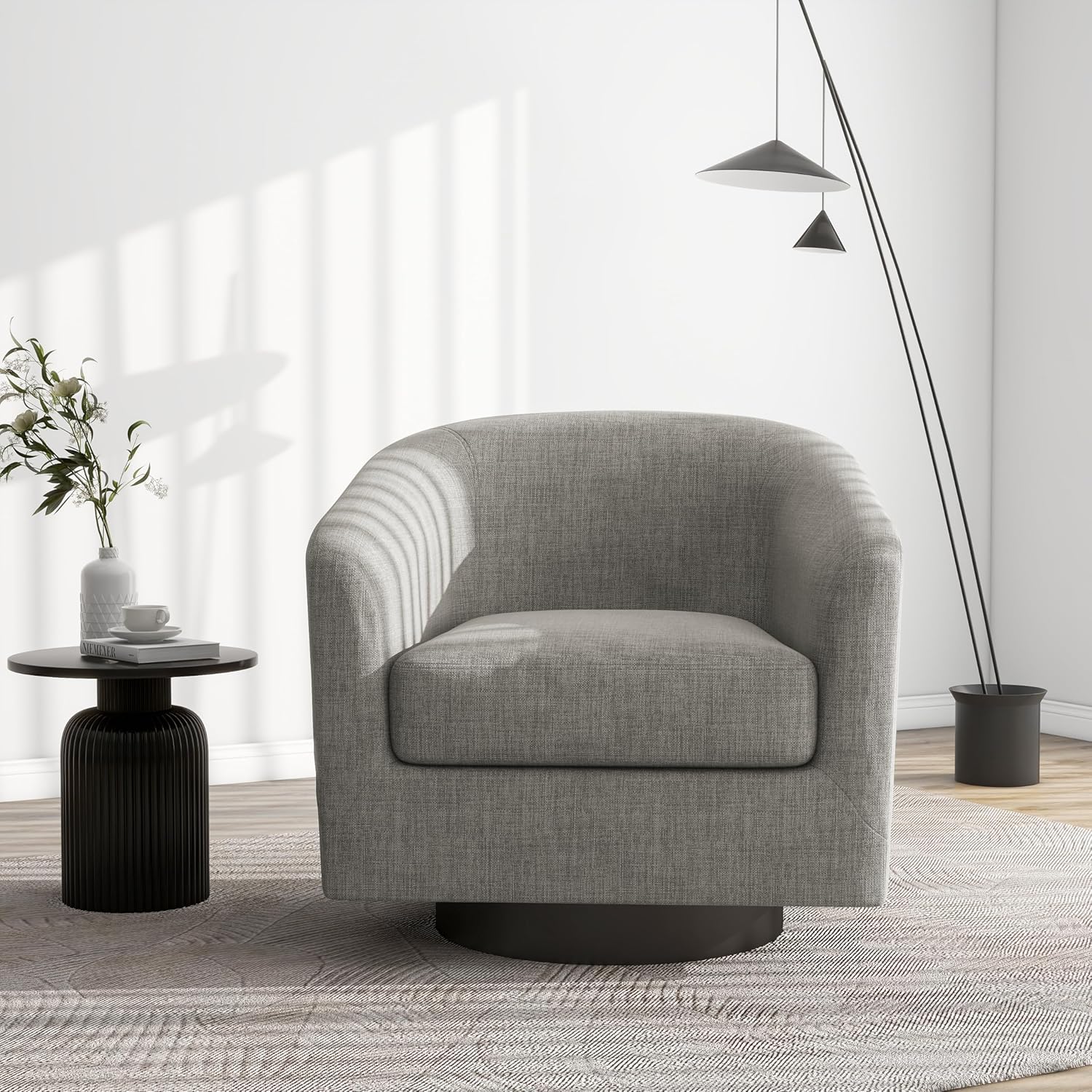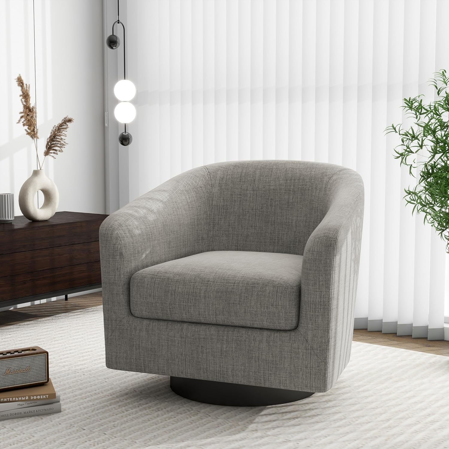 - 360 Degree Swivel Barrel Chair: This 360 degree round swivel chair designed for your leisure comfort. Heavy solid turntable, making it more stable and not wobbly