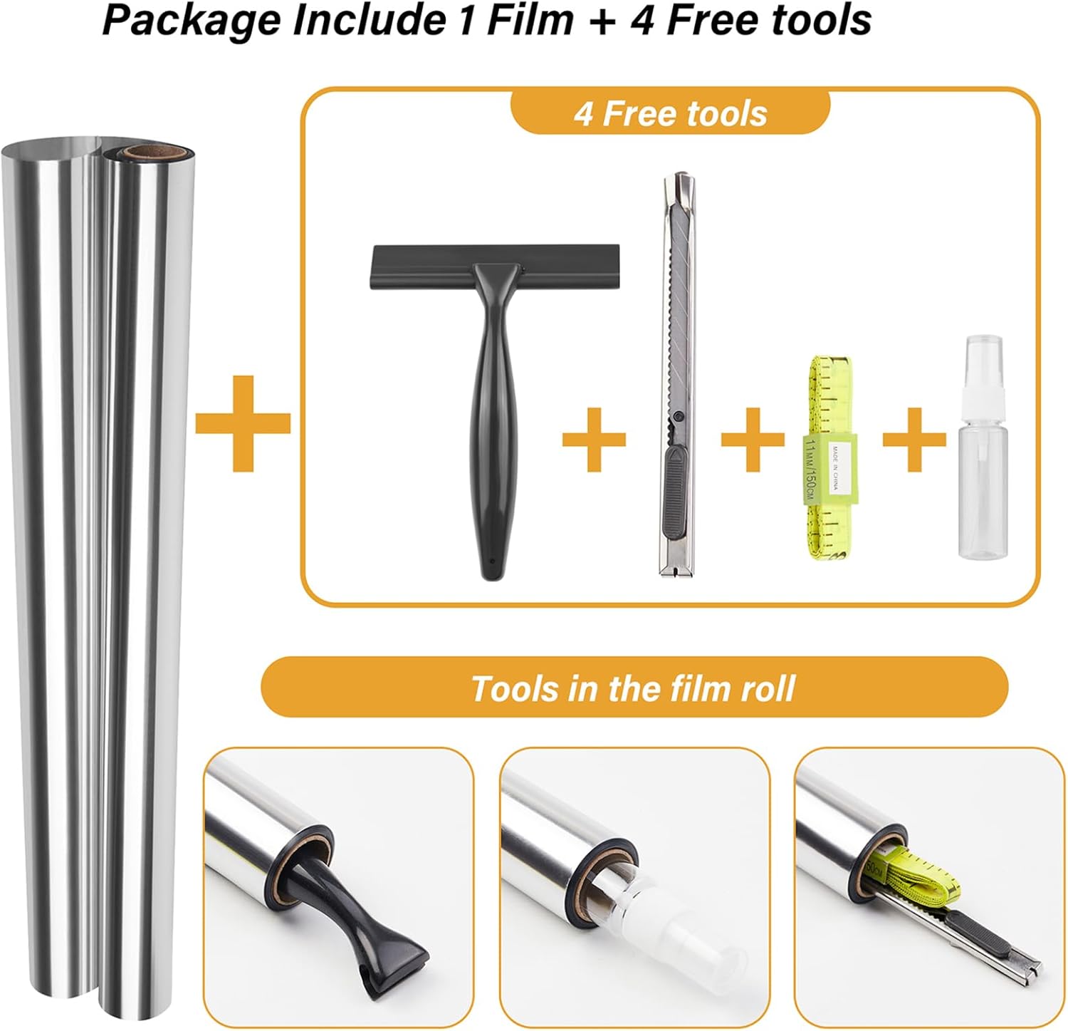 - EXTRA GIFT TOOL KITS: Each roll of this window privacy film comes with all the tools you need to install: spray bottle, utility knife, squeegee and measure tape to save money and time and make installation easier. The tools are in the paper tube, please tap tube to get tools out