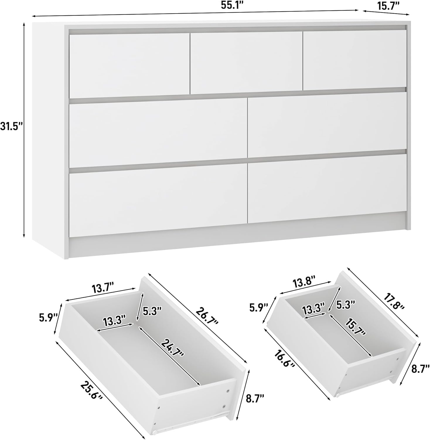 - ăGlossy handle-less designăDifferent from ordinary 55 inch long dresser for bedroom, our white 7 drawers malm dresser has full high-gloss design, adding a charming touch to your room. The unique beveled design of the drawers is full of modern elements. This large modern dresser with seven deep drawers can be matched with various themed homes.
