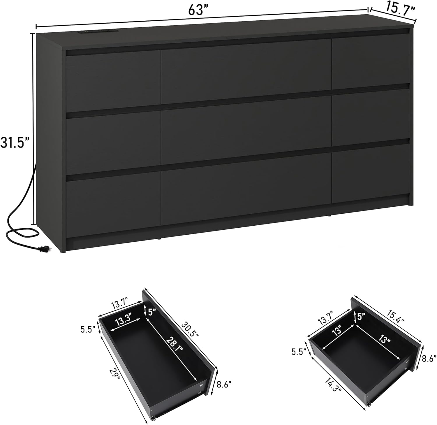 Black malm Dresser for Bedroom, 63 Inch Long 9 Drawers Dresser with Charging Station, Modern Large Wood Chest of Drawers Handle Free for Bedroom, Living Room, Entryway, Hallway, Black