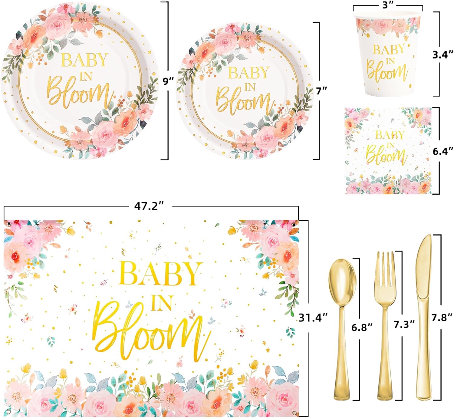 - 【Girl Baby Shower Decorations】- Its a girl baby shower decorations include 24 9 inch floral baby shower plates, 24 7-inch girl baby shower plates, 24 baby shower cups, 24 baby shower napkins, 24 sets of plastic utensils (forks, spoons, knives), 1 47.2*31.5in baby in bloom backdrop, 169 pieces in total.This is a great girl baby shower plates and napkins party supplies.