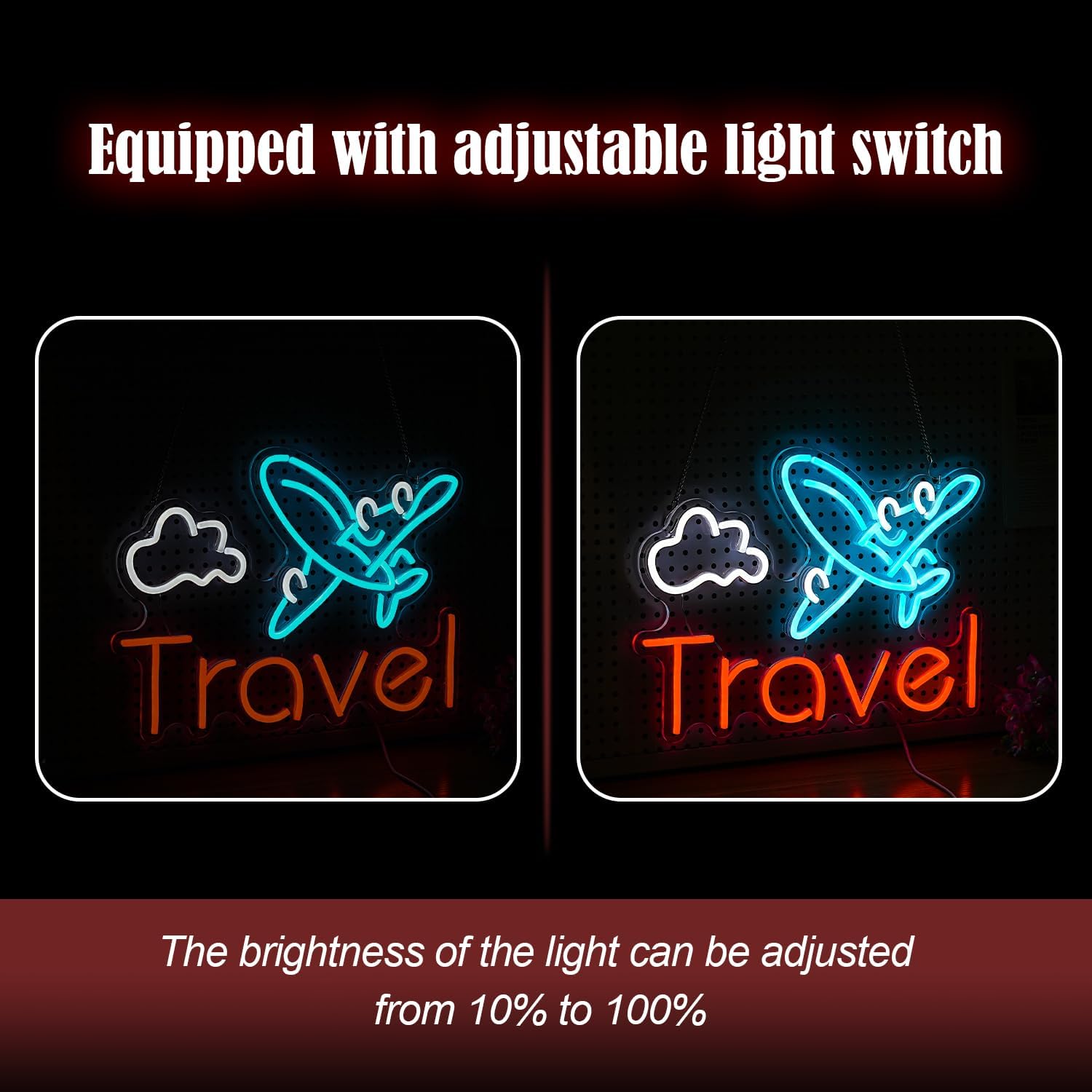 - Travel Neon Sign: Take this amazing travel neon sign of blue plane and cloud, paired with bold red 'travel' letters, and let's embark on a relaxing journey that adds a touch of wanderiness to any space! The dynamic contrast between dreamy blue hues and fiery red text creates a charming focal point, perfect for sparking conversation and elevating your decorative and artistic talents.