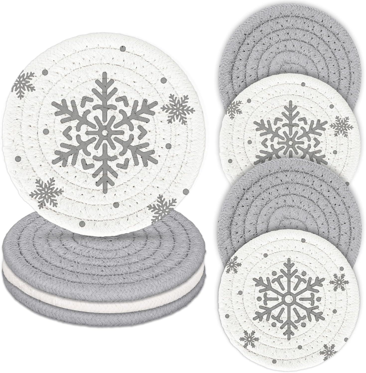 - The Package Includes - 4Pcs winter theme handmade braided cotton coasters in two different designs, 2Pcs for gray and 2Pcs for snowflakes, enough to meet your various needs.