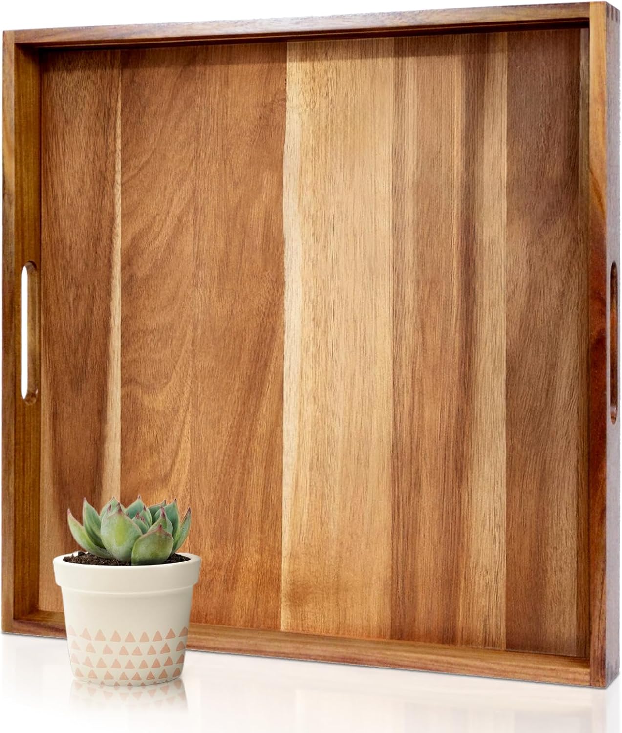 20 Inches Square Acacia Wood Ottoman Tray, Extra Large Wooden Serving Tray with Handles for Living Room, Serving Food Breakfast, Ottoman Coffee Table Couch Sofa Kitchen