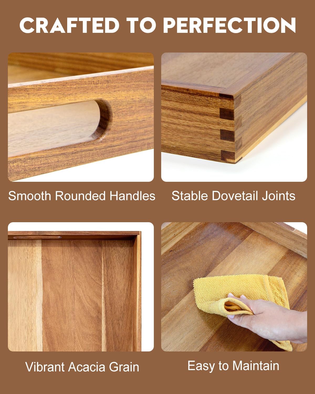 - Easy to Care For: Maintain the beauty of your Acacia wood tray with minimal effort. Simply wipe with a damp cloth to clean. For added longevity, occasionally treat the wood with a food-safe mineral oil to keep it looking pristine.