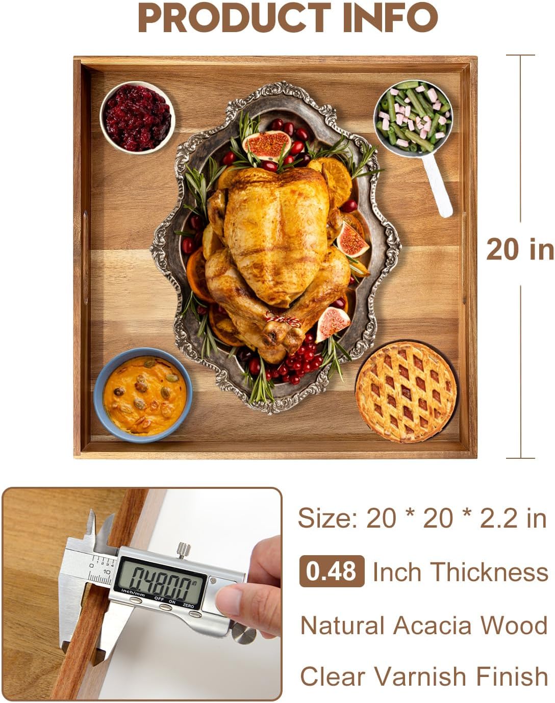 - Elegant Design & Versatile Functionality: Elevate your living space with our stylish Ottoman Tray. Measuring L20" x W20" x H2.2", this large wood tray is the perfect addition to any ottoman, coffee table, or sofa. Use it to serve breakfast, snacks, drinks, or as a decorative centerpiece.