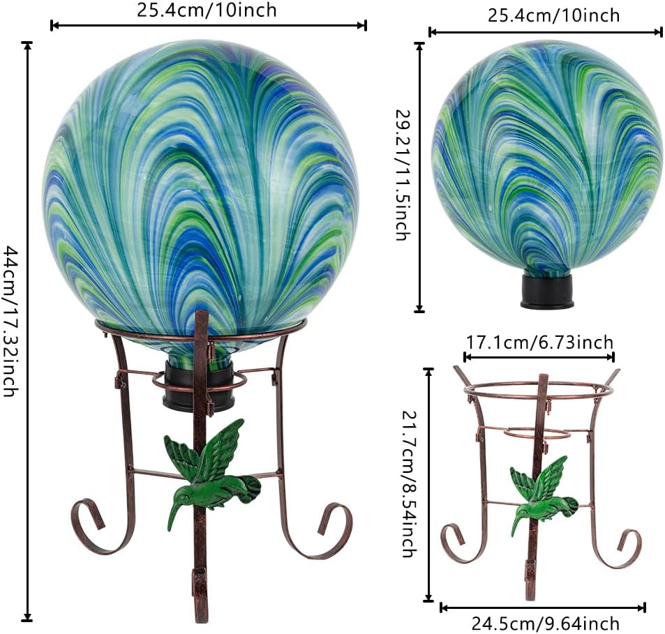 - PERFECT SIZE: This gazing ball is 10 inches in diameter and 11.5 inches high.The base of the gazing ball is 1.5 inches high and 2.1 inches in diameter.The gazing ball stand is 15 inches hih.The rubber cap on the bottom protects the edges from damage from bumps and vibrations and makes this gazing ball easier to display on a stand (stand included)