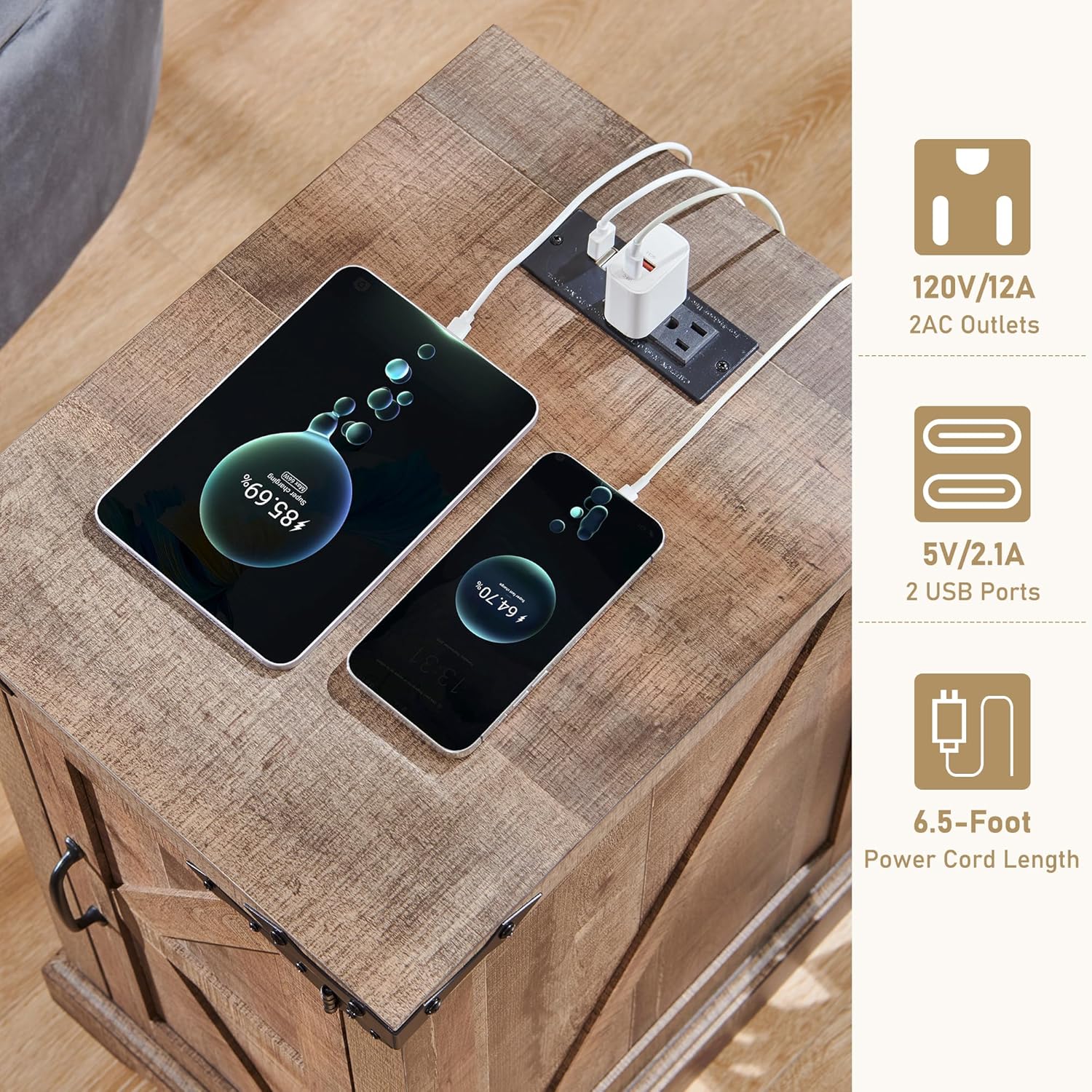 JXQTLINGMU Nightstand with Charging Station, Rectangular Farmhouse End Table with Barn Door and Adjustable Storage Shelf, 17" Deep Wood Rustic Sofa Side Table for Living Room, Bedroom, Light Brown