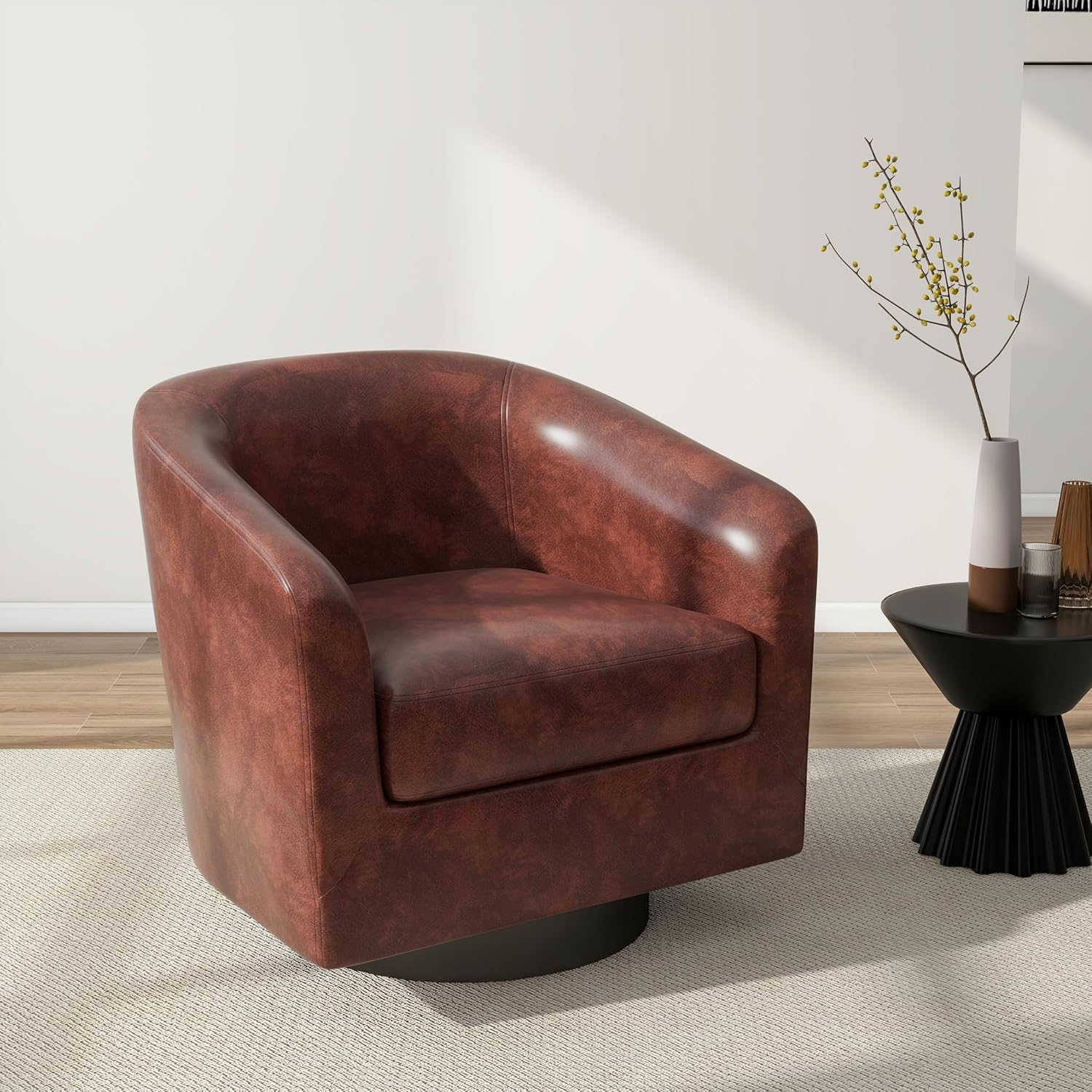 Swivel Barrel Accent Chair, Modern Round Faux Leather Arm Chair for Living Room, Bedroom, Comfy Club Reading Chairs for Adults(Faux Leather, Red Brown, Set of 2)