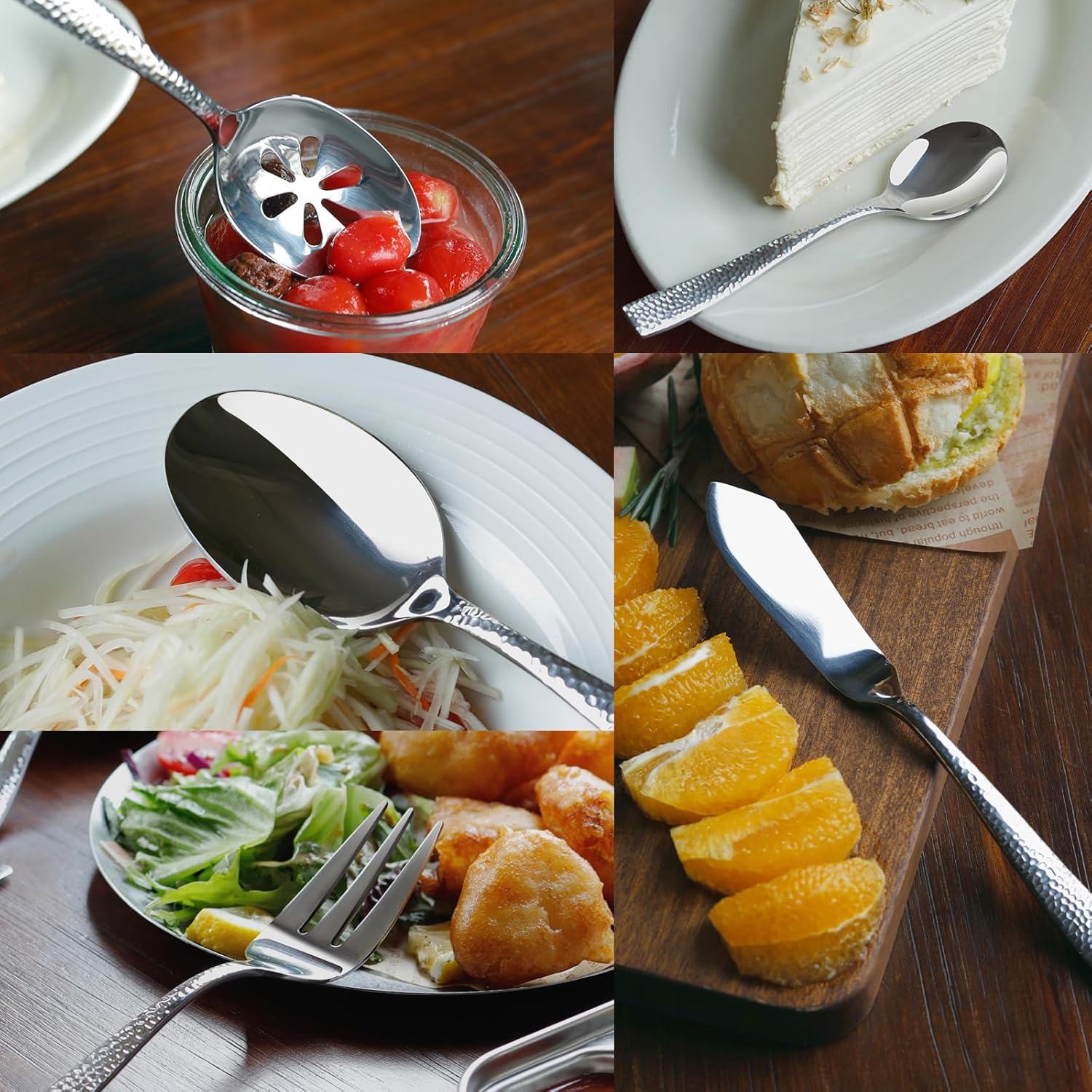 - 【APPEARANCE AND DESIGN】Shiny silver color and mirror polish, unique design with hammered handle, dishwasher safe