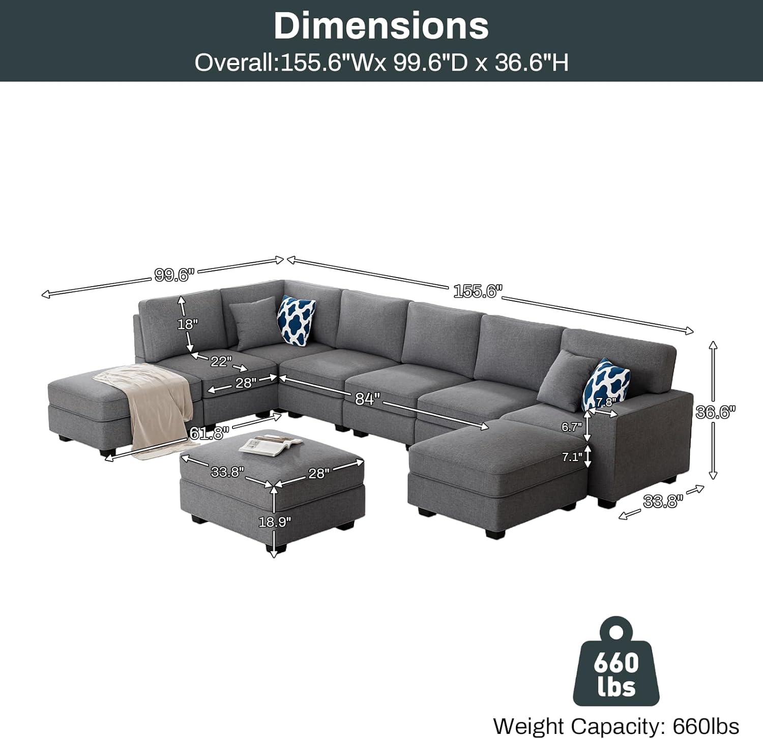 - ăErgonomic DesignăThe backrest of the couches for living room perfectly fits the human body curve, the armrests are wide and at the right height, and the living room sofa as a whole is ergonomically designed to give you comfortable support. The modular sectional sofa is paired with multiple multi-functional small pillows, allowing you to relax anytime, anywhere. The oversized couch has a weight capacity of up to 660 pounds to give you stable support.