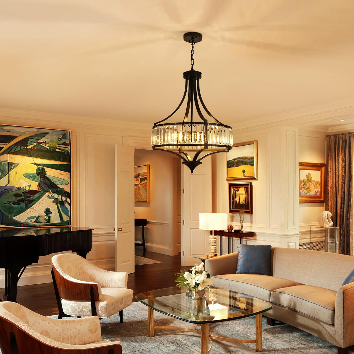 - Modern Farmhouse & Antique Style: Black modern farmhouse chandelier is crafted by skillful artisans. The crystal strips in the main part are skillfully arranged to form an elegant circular structure. Whether it is in the common living room where you spend time with your loved ones, the dining room where you enjoy cooked meals, the chic chandelier fits right in to light up every moment spent inside the comfort of your home.