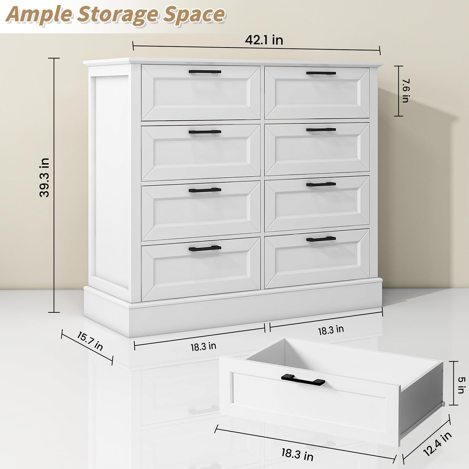 Odeekea White Dresser for Bedroom, Wood Dresser with 8 Drawers, Chest of Drawer for Bedroom Living Room Entryway Hallway, Modern Farmhouse Style