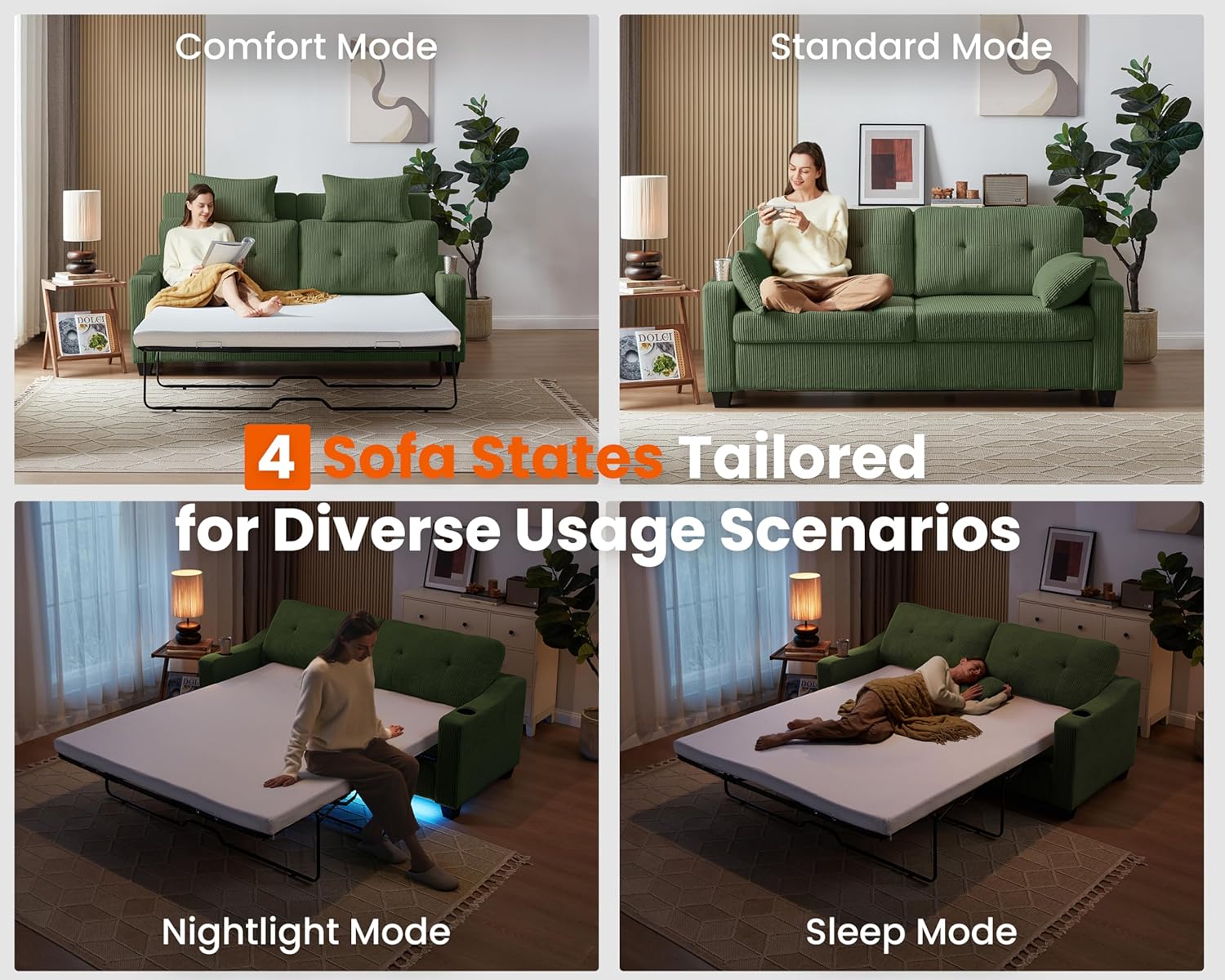Pull Out Sofa Bed, Full Size Sleeper Sofa, 2-in-1 Convertible Corduroy Couch with USB Charging, Memory Form Couch for Living Room, Apartment and Small Space (Green, Corduroy - Queen Size)