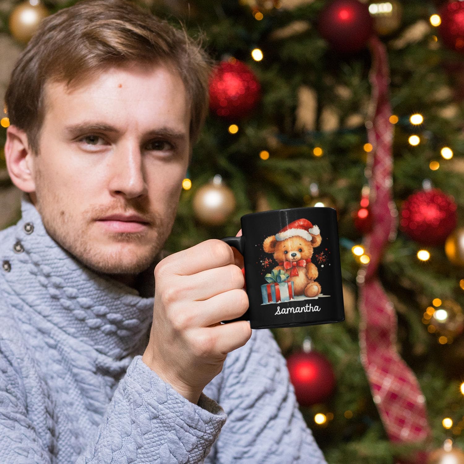 - š UNIQUE DESIGN MUG: Spread holiday cheer with this "Custom Name Xmas Teddy Bear Cup" featuring a cute teddy bear in a Santa hat beside a festive gift. Click "Customize Now" to add a name, making it a personalized gift for the holiday season. This black ceramic mug is ideal for enjoying warm winter drinks in a cozy setting.